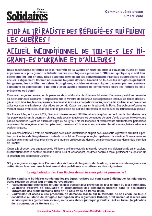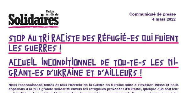 L’union syndicale Solidaires condamne les pratiques racistes qui consistent à distinguer les migrant-es et les réfugié-es selon leur origine et revendique :