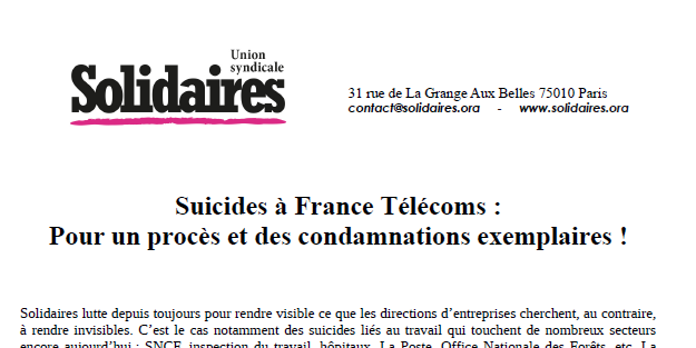 Face à une situation gravissime et qui s’est étendue aujourd’hui à de nombreux secteurs, l’Union syndicale Solidaires s'est portée partie civile dans ce procès, aux côtés des fédérations des télécoms et des nombreuses victimes parties civiles.