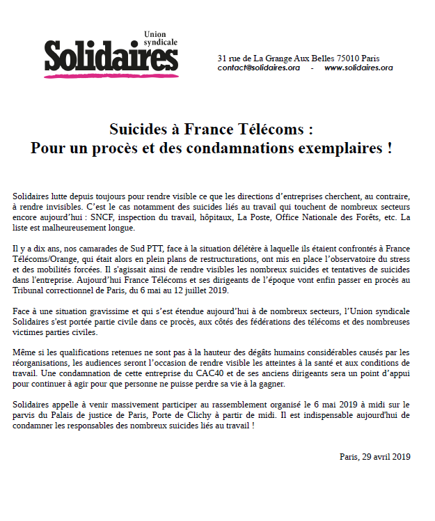 Solidaires appelle à venir massivement participer au rassemblement organisé le 6 mai 2019 à midi sur le parvis du Palais de justice de Paris, Porte de Clichy à partir de midi. Il est indispensable aujourd'hui de condamner les responsables des nombreux suicides liés au travail !