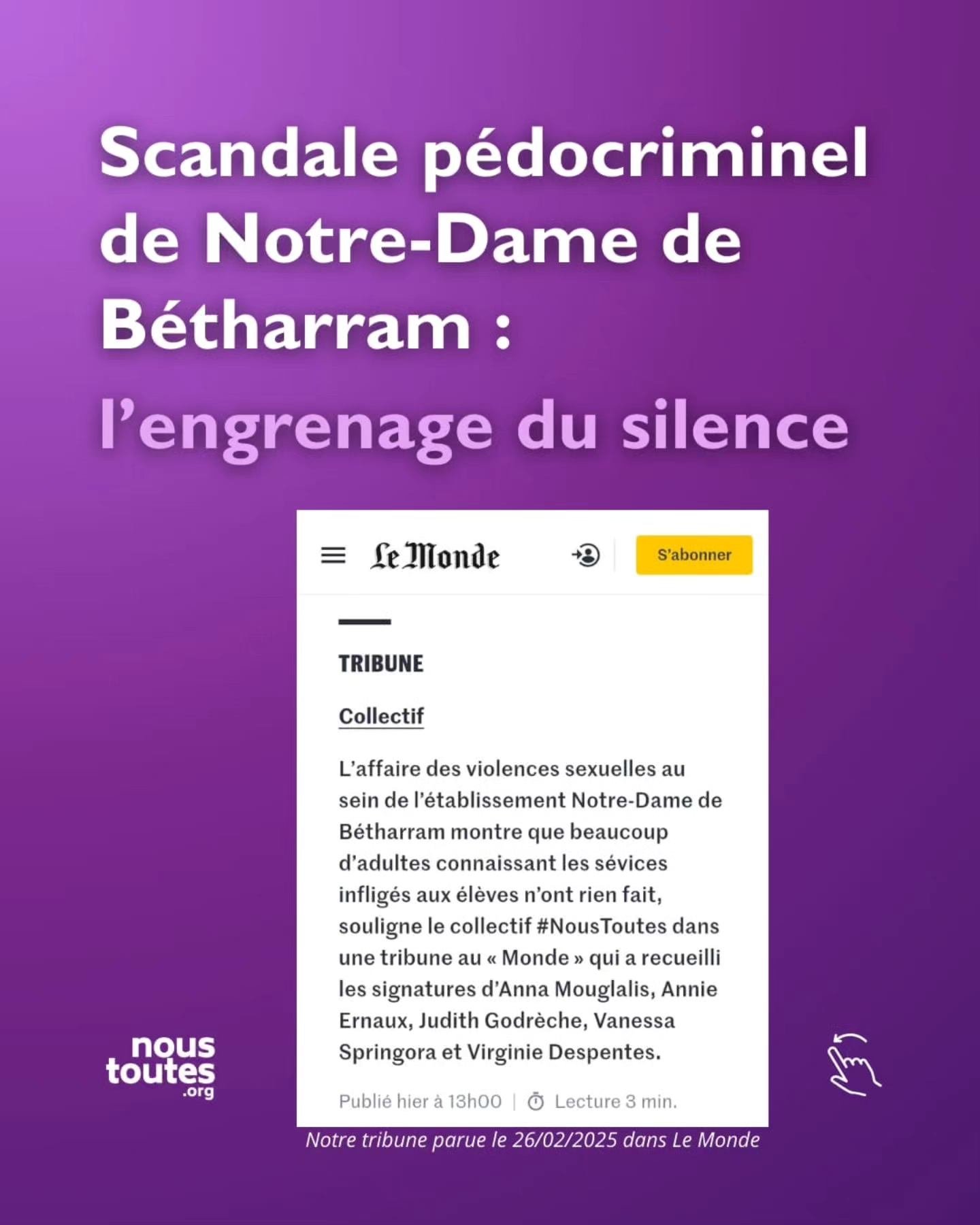 Aujourd’hui alors que des voix se lèvent pour réclamer justice et dénoncer ce système de silence et de protection des agresseurs par les institutions, nous, personnes engagées dans la lutte contre les violences sexistes et sexuelles, membres de la société civile, attendons des réponses et des actes. Les auteurs des violences à l’école Notre-Dame de Bétharram et ceux qui les ont protégés durant trente ans ne doivent en aucun cas rester impunis. Leur niveau de responsabilité est à l’échelle de leur pouvoir.