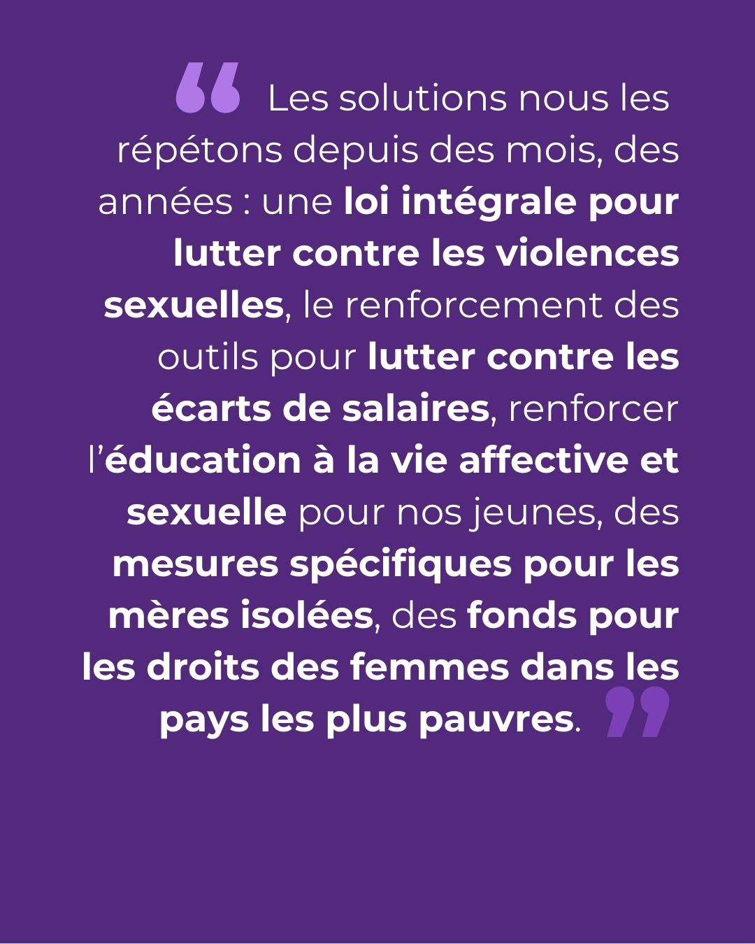 A défaut d’être une vraie grande cause, l’égalité de genre ne doit pas disparaître de l’agenda politique au gré de l’instabilité institutionnelle. En France et bien au-delà de nos frontières, grâce à notre diplomatie féministe, les moyens financiers doivent être mis sur la table et les discours transformés en actes. Les solutions nous les répétons depuis des mois, des années : une loi intégrale pour lutter contre les violences sexuelles, le renforcement des outils pour lutter contre les écarts de salaires, renforcer l’éducation à la vie affective et sexuelle pour nos jeunes, des mesures spécifiques pour les mères isolées, des fonds pour les droits des femmes dans les pays les plus pauvres. Le gouvernement doit enfin écouter les organisations de défense des droits des femmes ainsi que les syndicats et élaborer un réel plan d’urgence !