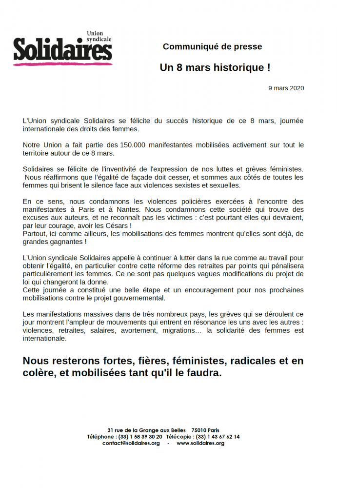 [Voir également en pj, le communiqué unitaire "8 mars : marche des Grandes Gagnantes"]