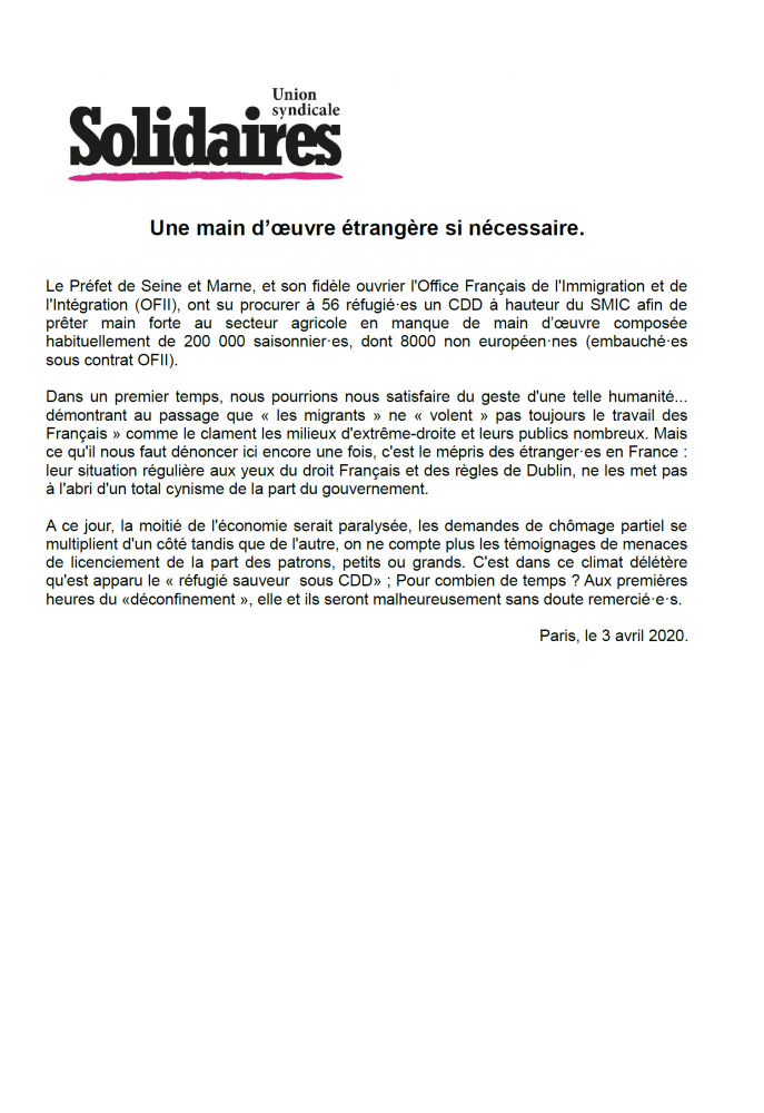 A ce jour, la moitié de l'économie serait paralysée, les demandes de chômage partiel se multiplient d'un côté tandis que de l'autre, on ne compte plus les témoignages de menaces de licenciement de la part des patrons, petits ou grands. C'est dans ce climat délétère qu'est apparu le « réfugié sauveur sous CDD» ; Pour combien de temps ? Aux premières heures du «déconfinement », elle et ils seront malheureusement sans doute remercié·e·s.