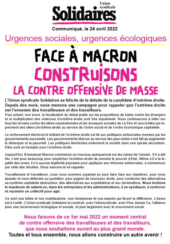 Pour autant, son score, la focalisation du débat public sur les propositions de haine contre les étrangers et la multiplication des violences d’extrême-droite sont très inquiétants. Nous continuerons à lutter sur tous les terrains contre les idées nauséabondes et les arnaques sociales de Le Pen et ceux/celles qui reprennent des idées d'extrême-droite au service de l’ordre social et de l’ordre économique capitaliste.