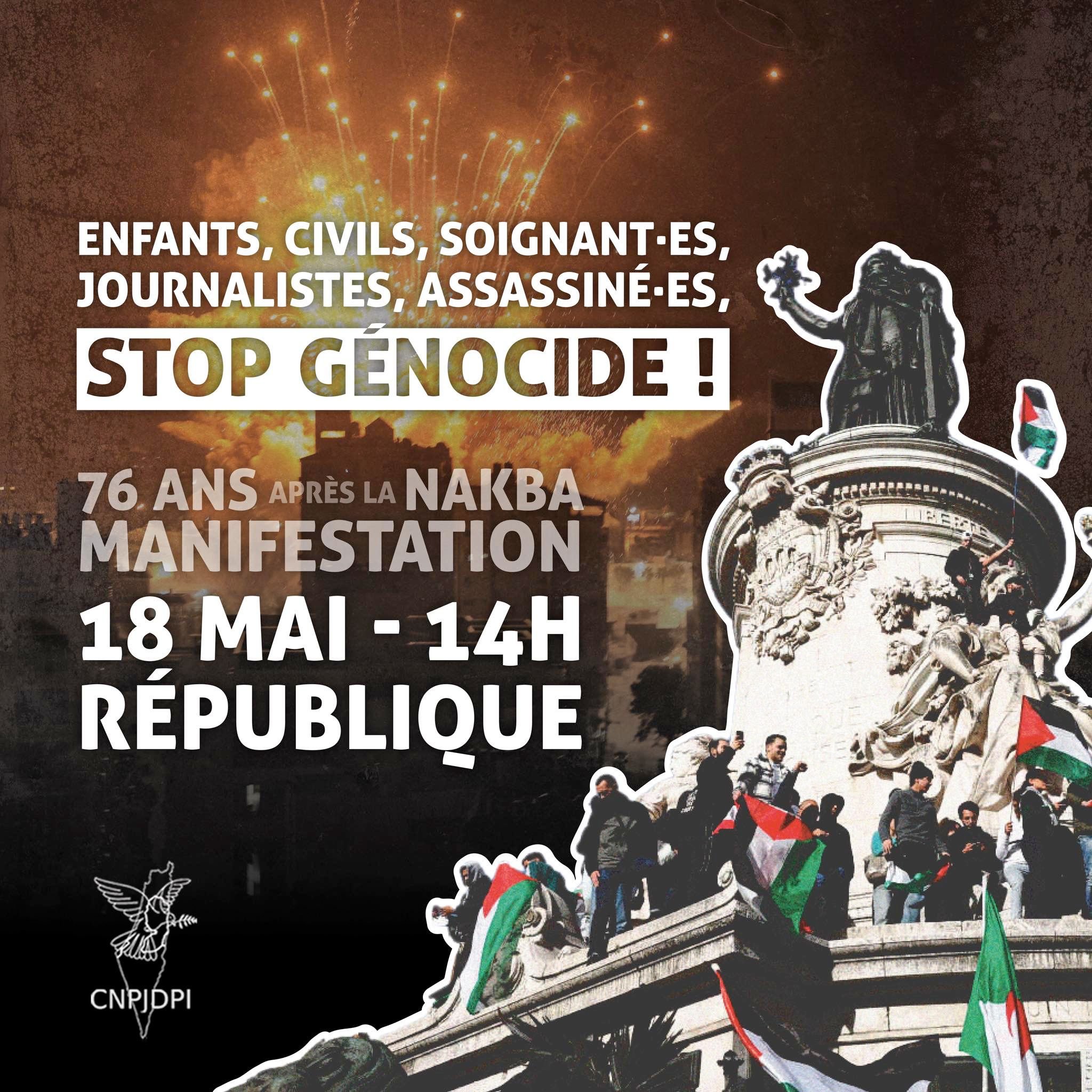 (18 mai, appel du CNPJDPI) Palestine - Manifestation Stop Génocide