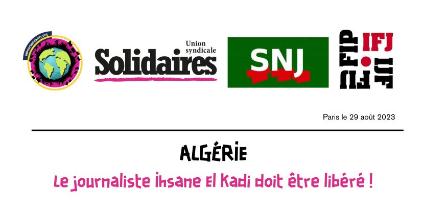 Le Syndicat national des journalistes (SNJ), première organisation de la professsion, l’Union syndicale Solidaires et la Fédération internationale des journalistes (FIJ) demandent la libération immédiate d’Ihsane El Kadi. Nos organisations réclament la fin de la censure et de la répression ciblée exercées contre les médias et journalistes indépendants en Algérie au moyen d’articles du Code pénal rédigés en termes vagues, utilisés pour violer le droit à la liberté d’expression.