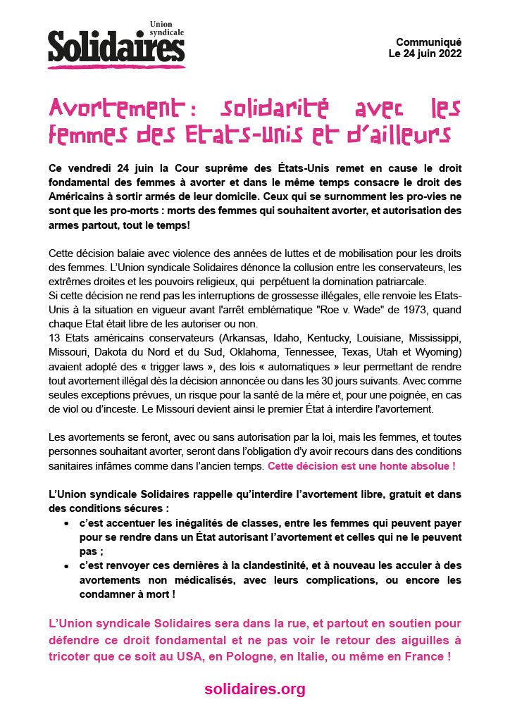 L’Union syndicale Solidaires sera dans la rue, et partout en soutien pour défendre ce droit fondamental et ne pas voir le retour des aiguilles à tricoter que ce soit aux USA, en Pologne, en Italie, ou même en France !