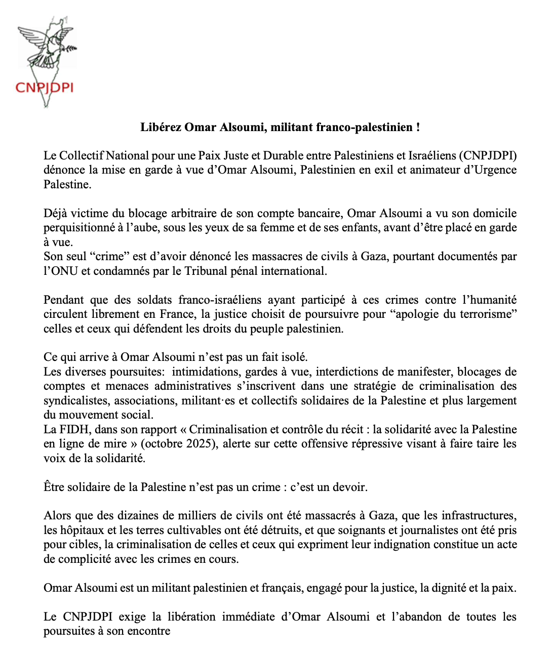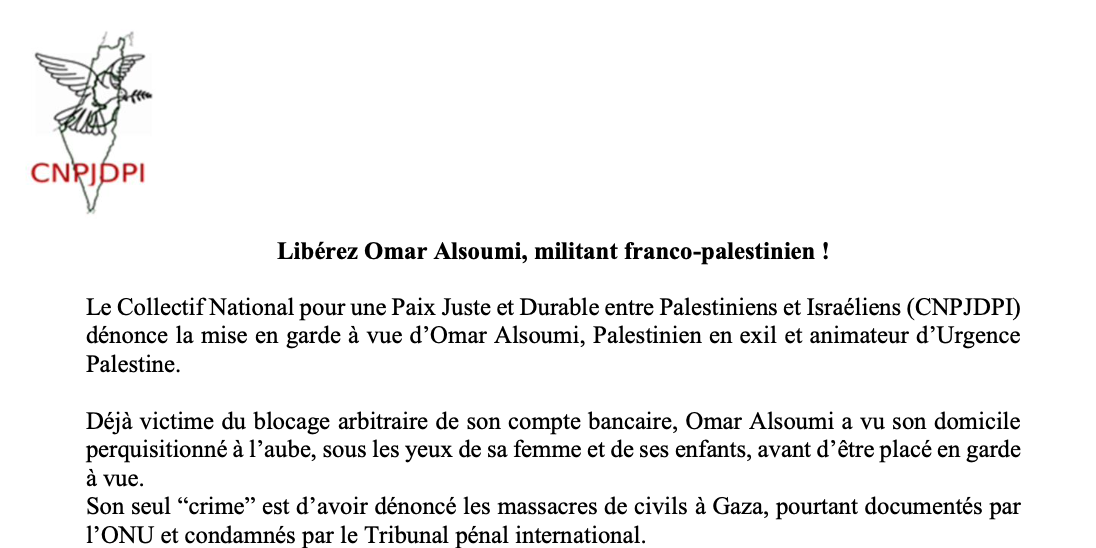 Le Collectif National pour une Paix Juste et Durable entre Palestiniens et Israéliens (CNPJDPI) dénonce la mise en garde à vue d’Omar Alsoumi, Palestinien en exil et animateur d’Urgence Palestine.