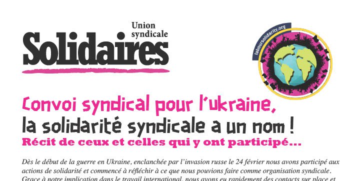 Depuis le mois de mars, une démarche intersyndicale a été engagée et réunit aujourd’hui toutes les organisations syndicales françaises (https://solidaires.org/sinformer-et-agir/actualites-et-mobilisations/communiques/un-convoi-intersyndical-pour-lukraine-appel-unitaire-des-organisations-syndicales-francaises/ https://solidaires.org/sinformer-et-agir/actualites-et-mobilisations/internationales/un-convoi-intersyndical-pour-lukraine-point-detape/ ).