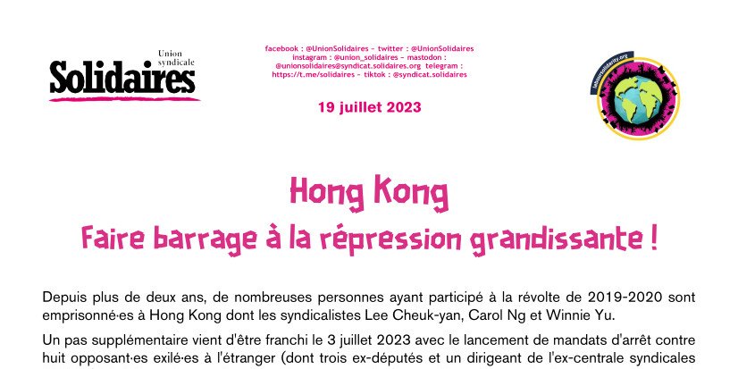 Christopher Mung Siu-tat, l'un des responsables de l'ex-centrale syndicale HKCTU refuse de se laisser intimider par de tels menaces. Aujourd'hui exilé en Grande-Bretagne, il a notamment déclaré le 3 juillet : « Je ne cesserai pas de défendre les droits des travailleurs/euses de Hong Kong à l'étranger, notamment en travaillant avec des organisations internationales et des syndicats dans différents pays ». Il était notamment présent au printemps dernier dans le carré de tête d'une manifestation syndicale parisienne contre la réforme des retraites du gouvernement français.