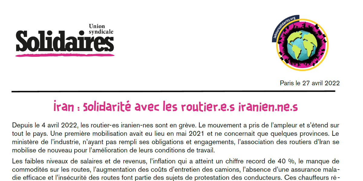 Depuis le 4 avril 2022, les routier-es iranien-nes sont en grève. Le mouvement a pris de l’ampleur et s’étend sur tout le pays. Une première mobilisation avait eu lieu en mai 2021 et ne concernait que quelques provinces. Le ministère de l’industrie, n’ayant pas rempli ses obligations et engagements, l’association des routiers d’Iran se mobilise de nouveau pour l’amélioration de leurs conditions de travail.