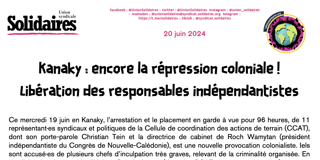 • affirme sa solidarité avec le peuple kanak et avec toutes les victimes (et leurs proches) de la répression exercée, sur différents plans, par l’État français,