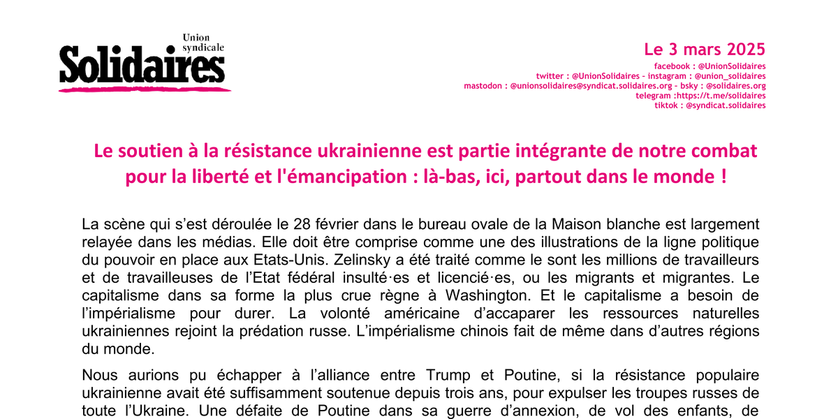 Le soutien à la résistance ukrainienne est partie intégrante de notre combat pour la liberté et l'émancipation : là-bas, ici, partout dans le monde !