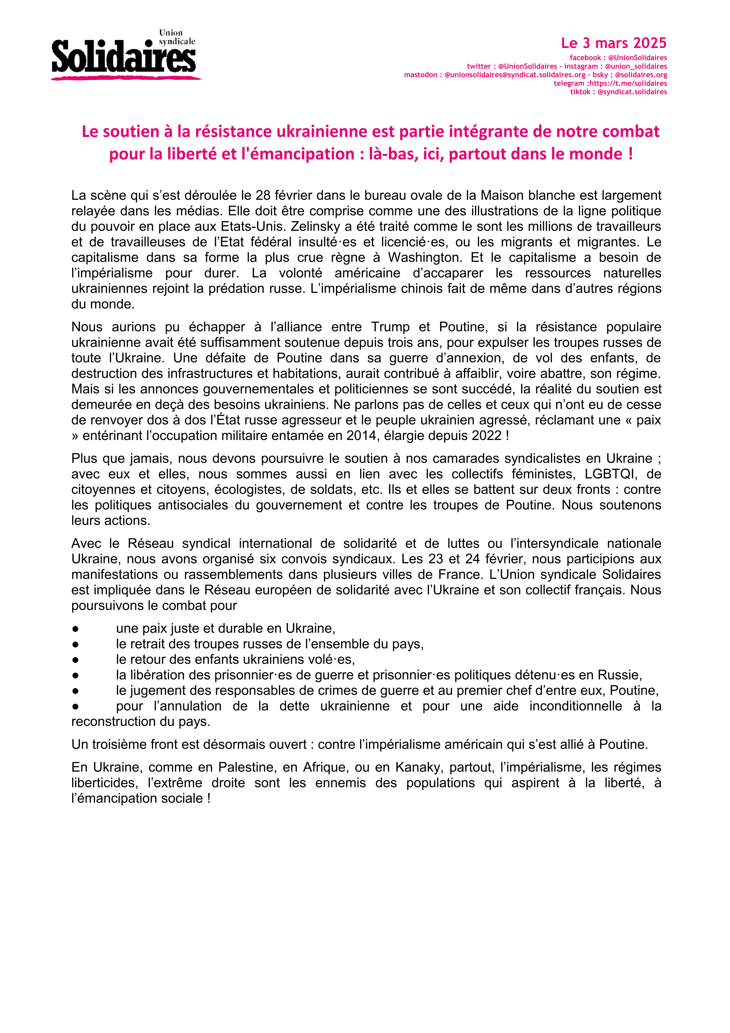 En Ukraine, comme en Palestine, en Afrique, ou en Kanaky, partout, l’impérialisme, les régimes liberticides, l’extrême droite sont les ennemis des populations qui aspirent à la liberté, à l’émancipation sociale !
