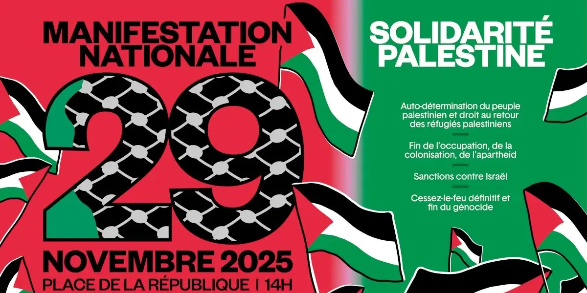 À Paris, lors de la manifestation nationale du 29 novembre, journée internationale de solidarité avec le peuple palestinien, nous montrerons la force de notre mobilisation pour les droits du peuple palestinien, et pour un monde fondé sur le droit et sur le respect de notre humanité commune.