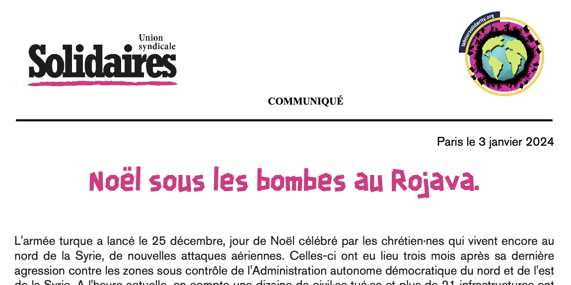 L'Union syndicale Solidaires réaffirme son soutien à la lutte des peuples au nord de la Syrie. Les raids aériens turcs doivent être empêchés par la mise en place d'une no-fly zone. La France, qui vient de vendre 355 Airbus à la Turquie, doit cesser de soutenir politiquement et économiquement le régime criminel d'Erdogan. Plus généralement, l'Union syndicale Solidaires soutient le droit des peuples à l'auto-détermination contre le colonialisme occidental et ses bras armés au Moyen-Orient, l'OTAN et l'armée israélienne.