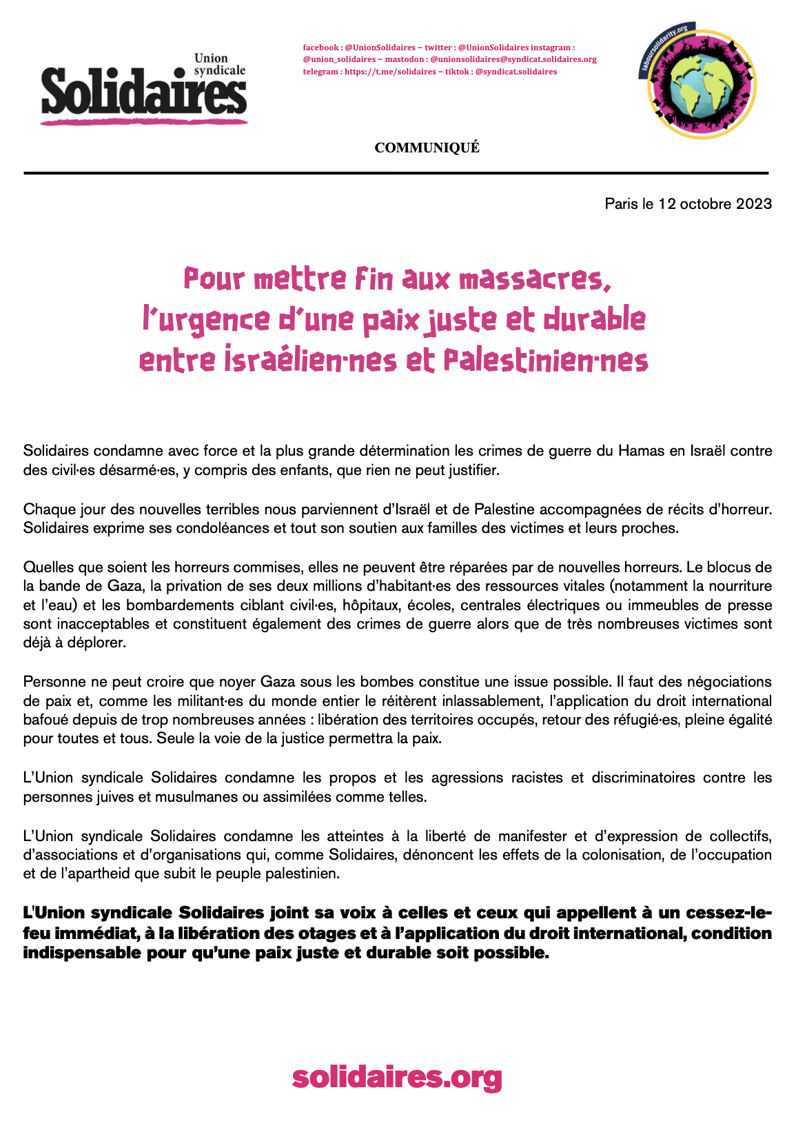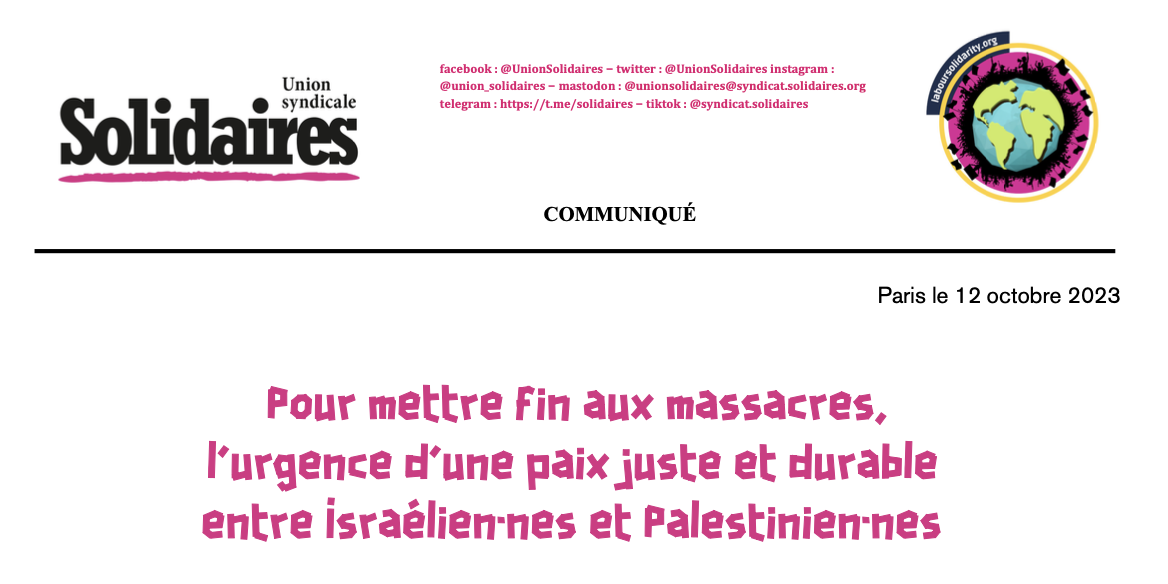 L'Union syndicale Solidaires joint sa voix à celles et ceux qui appellent à un cessez-le-feu immédiat, à la libération des otages et à l’application du droit international, condition indispensable pour qu’une paix juste et durable soit possible.