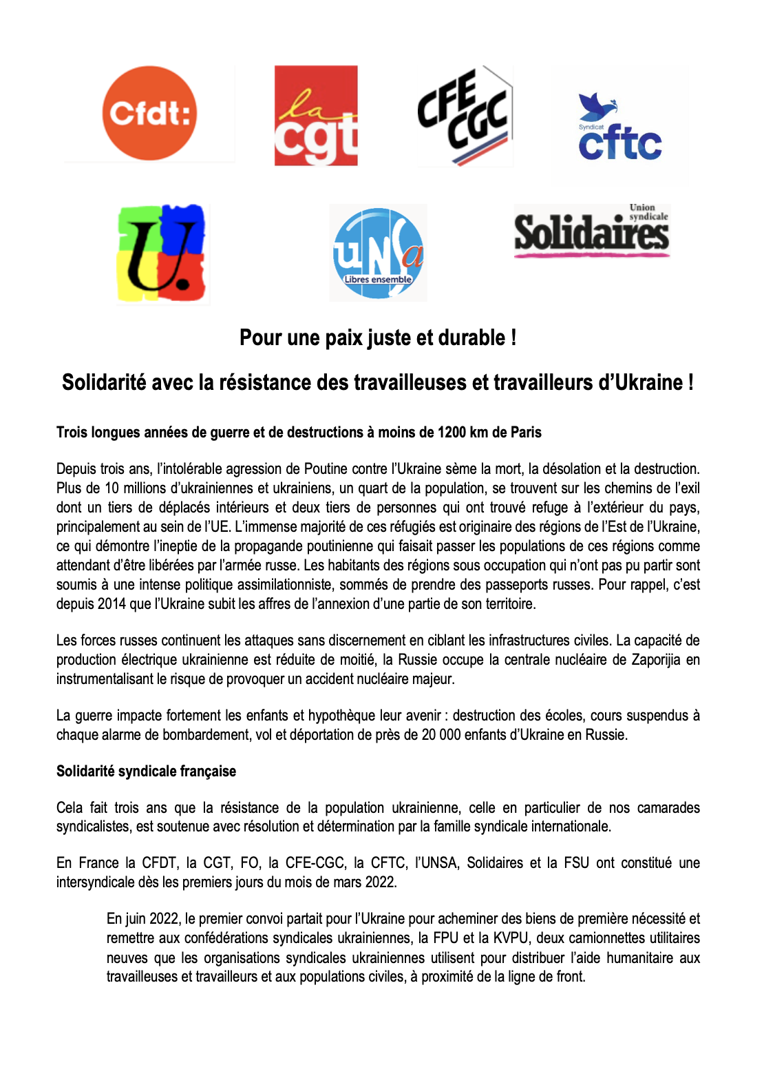 Les organisations syndicales françaises poursuivront ces efforts aussi longtemps que durera l’agression impérialiste russe contre l’Ukraine.