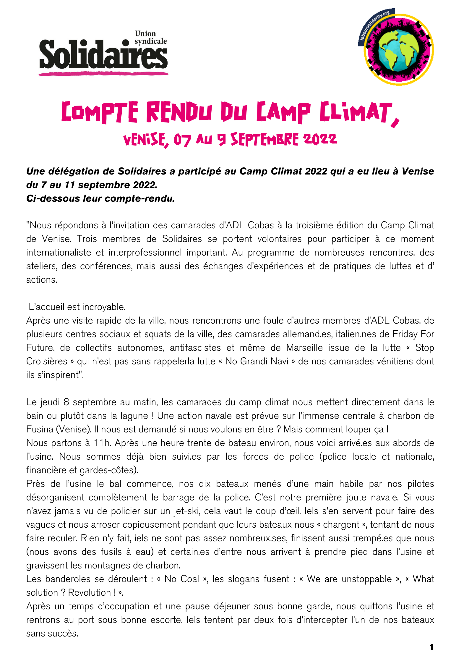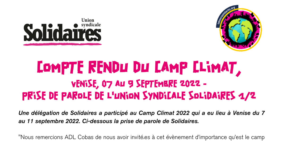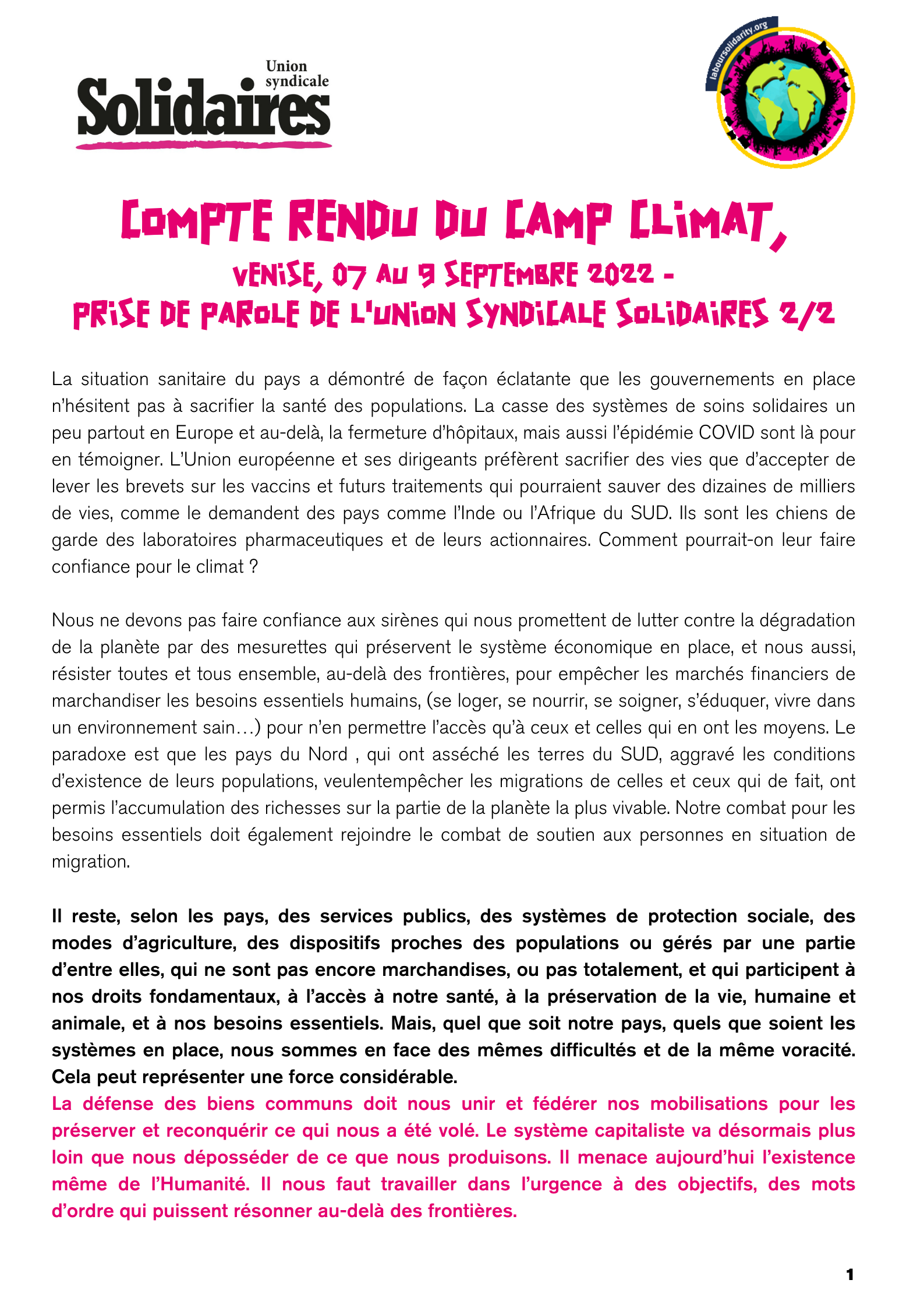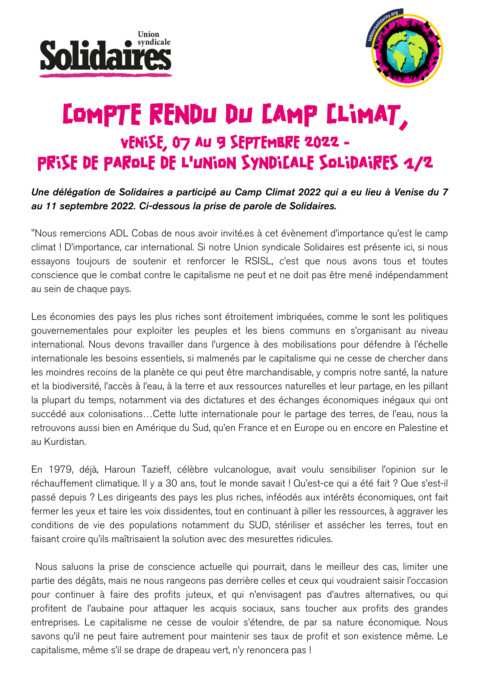 Nous remercions ADL Cobas de nous avoir invité.es à cet évènement d’importance qu’est le camp climat ! D’importance, car international. Si notre Union syndicale Solidaires est présente ici, si nous essayons toujours de soutenir et renforcer le RSISL, c’est que nous avons tous et toutes conscience que le combat contre le capitalisme ne peut et ne doit pas être mené indépendamment au sein de chaque pays.