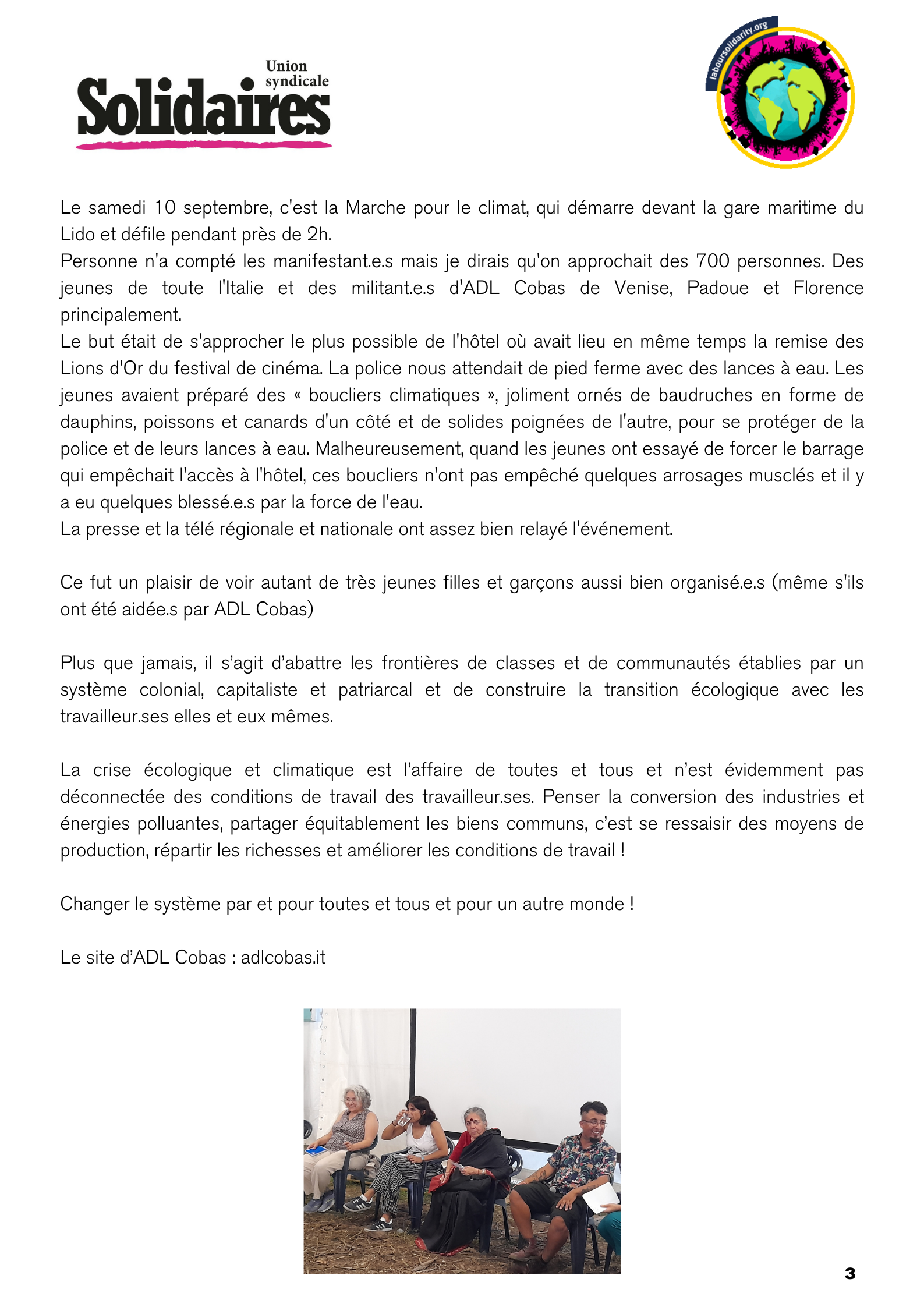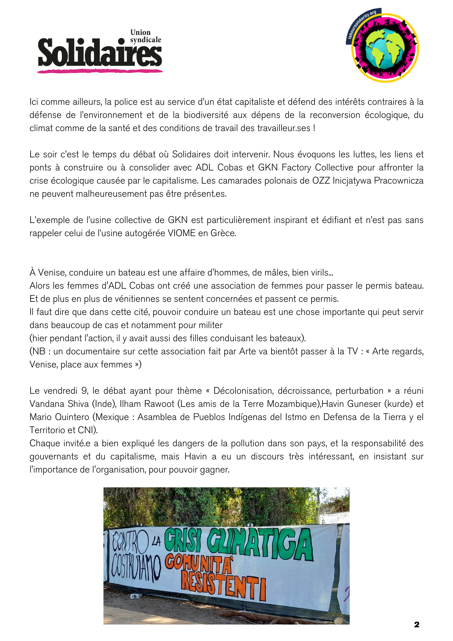 Nous répondons à l’invitation des camarades d’ADL Cobas à la troisième édition du Camp Climat de Venise. Trois membres de Solidaires se portent volontaires pour participer à ce moment internationaliste et interprofessionnel important. Au programme de nombreuses rencontres, des ateliers, des conférences, mais aussi des échanges d’expériences et de pratiques de luttes et d’ actions.