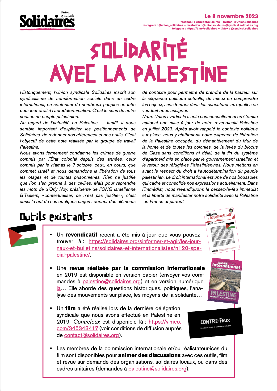 - Un revendicatif récent a été mis à jour que vous pouvez trouver là : https://solidaires.org/sinformer-et-agir/les-journaux-et-bulletins/solidaires-et-internationalistes/n120-special-palestine/.