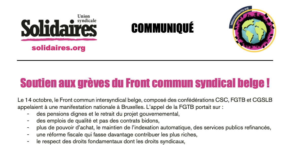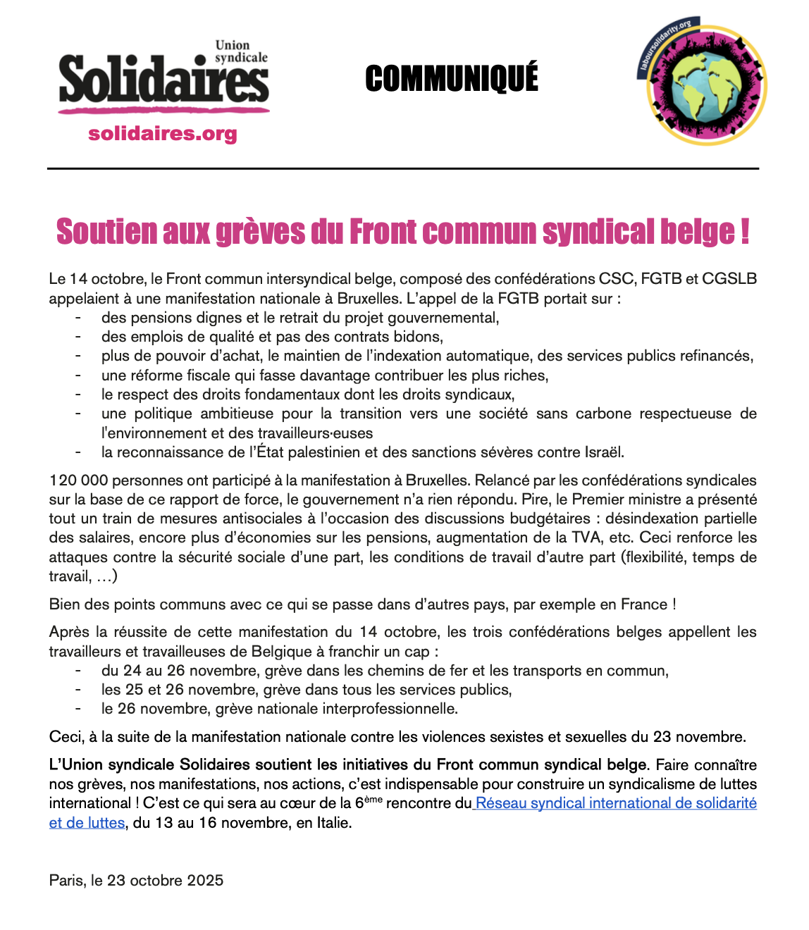 L’Union syndicale Solidaires soutient les initiatives du Front commun syndical belge. Faire connaître nos grèves, nos manifestations, nos actions, c’est indispensable pour construire un syndicalisme de luttes international ! C’est ce qui sera au cœur de la 6ème rencontre du Réseau syndical international de solidarité et de luttes, du 13 au 16 novembre, en Italie.