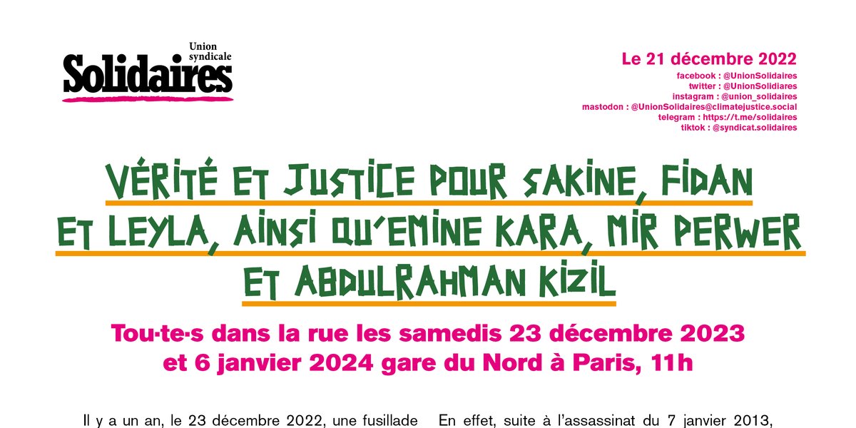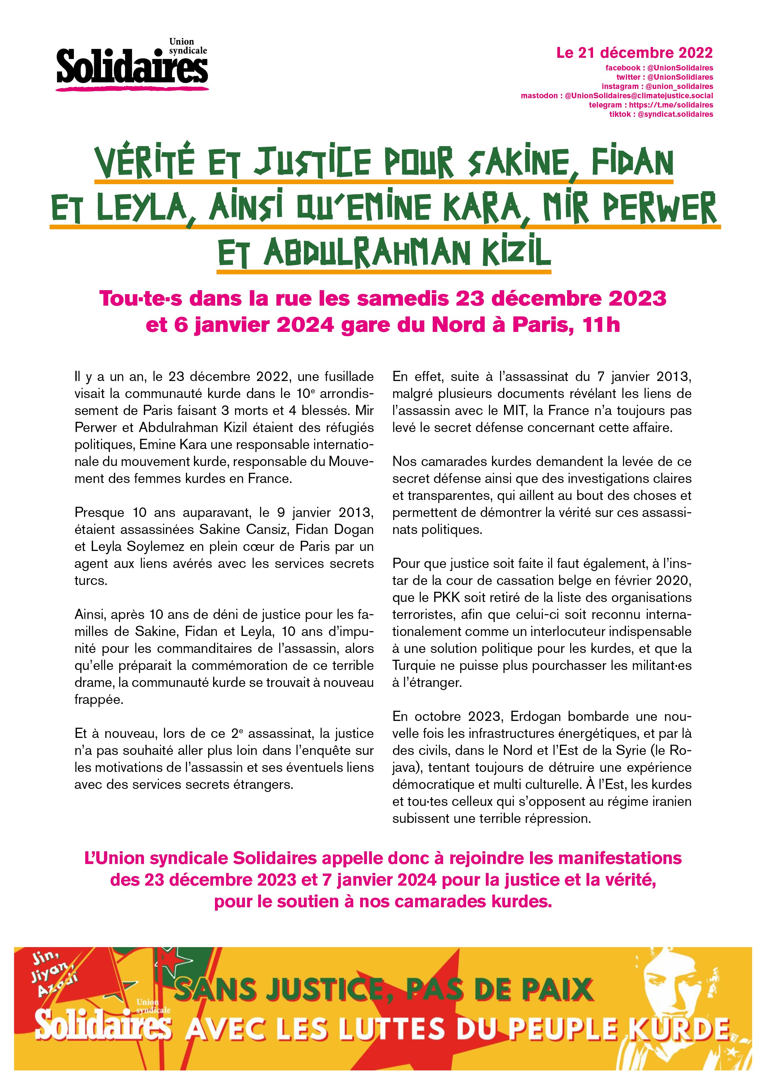 L’union syndicale Solidaires appelle donc à rejoindre les manifestations des 23 décembre 2023 et 7 janvier 2024 pour la justice et la vérité, pour le soutien à nos camarades kurdes.