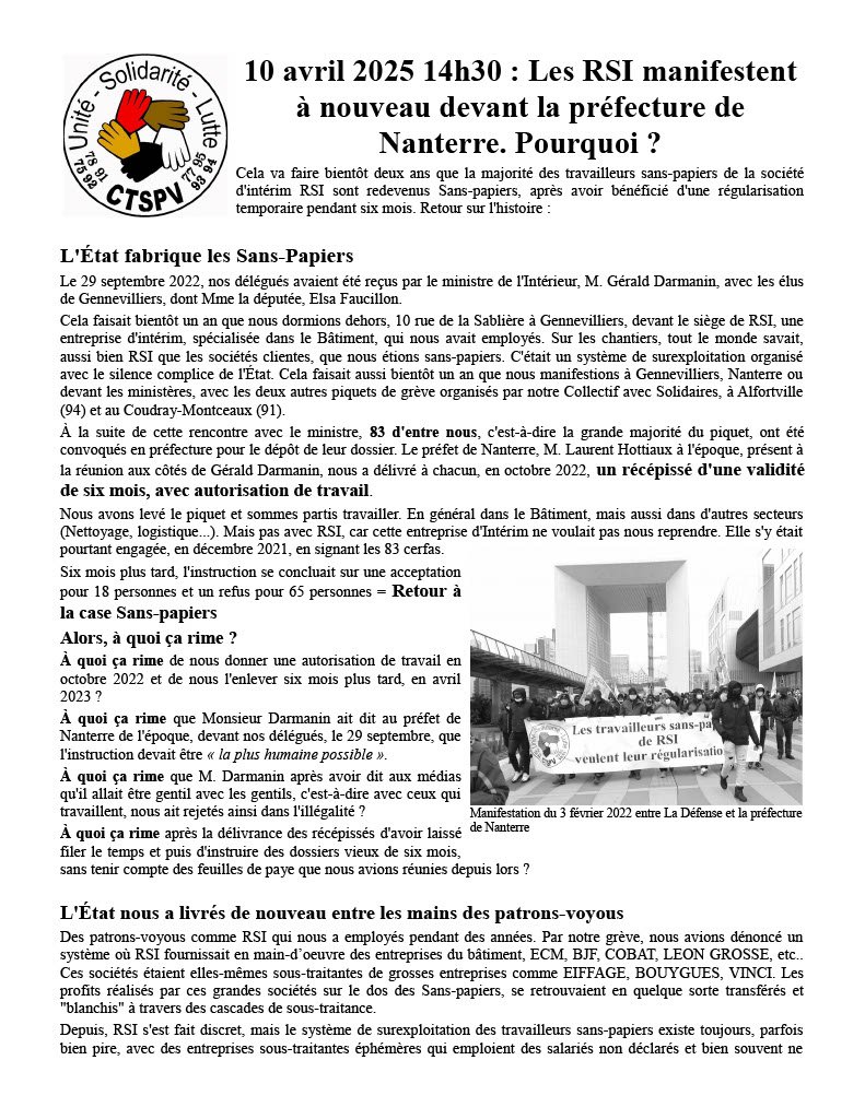 10 avril 2025 14h30 : Les RSI manifestent à nouveau devant la préfecture de Nanterre. Pourquoi ?