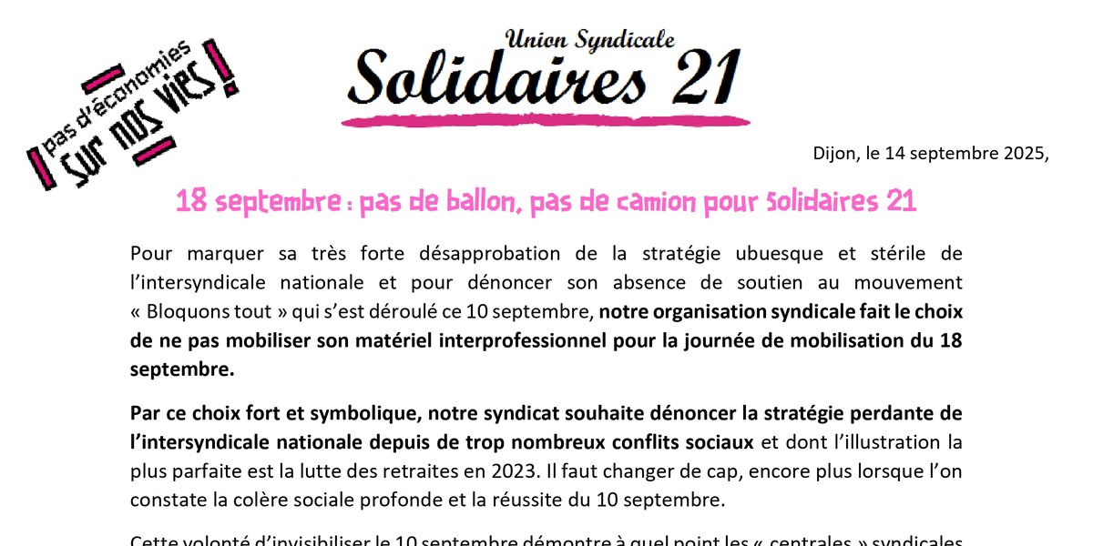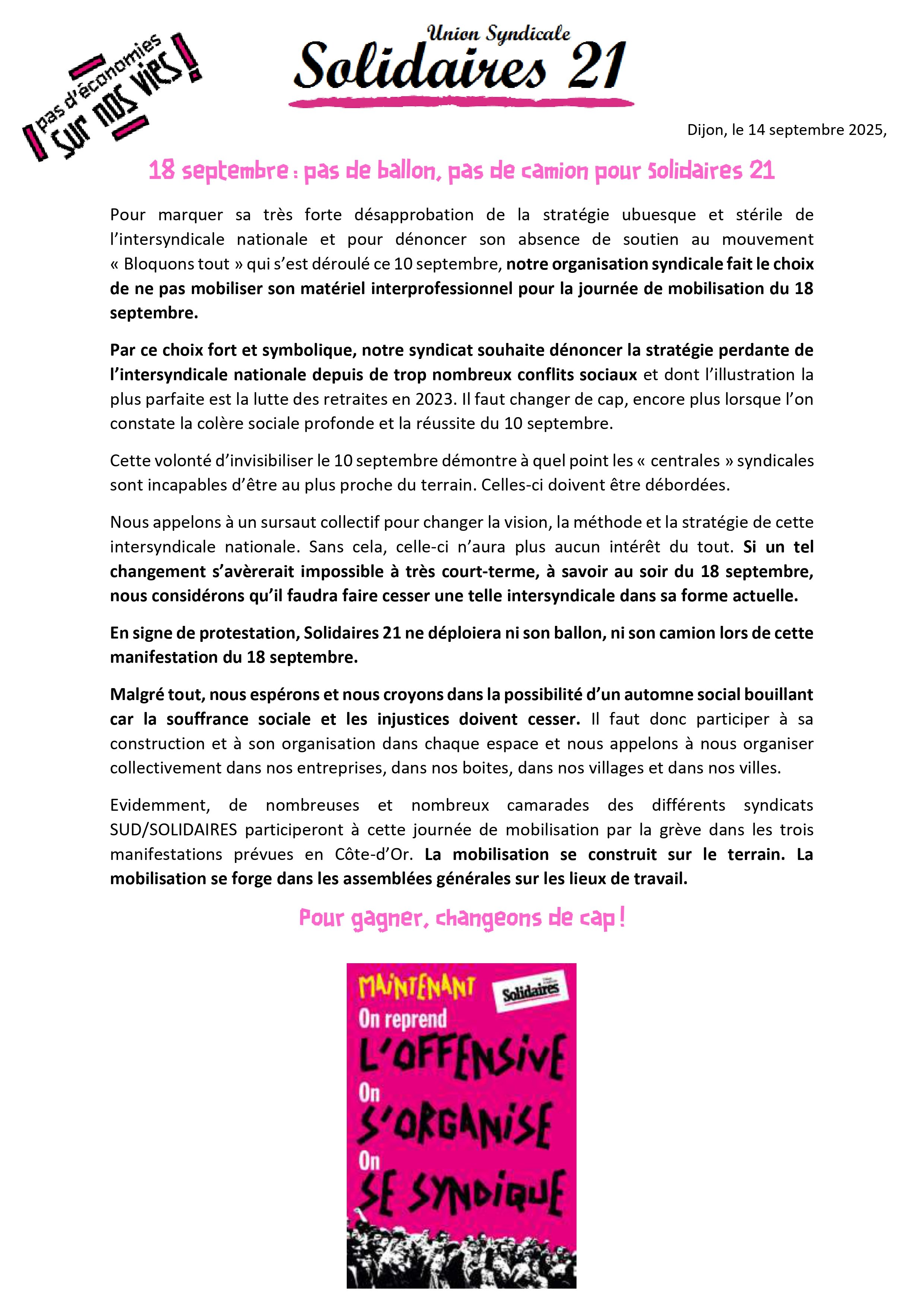 18 septembre : pas de ballon, pas de camion pour Solidaires 21