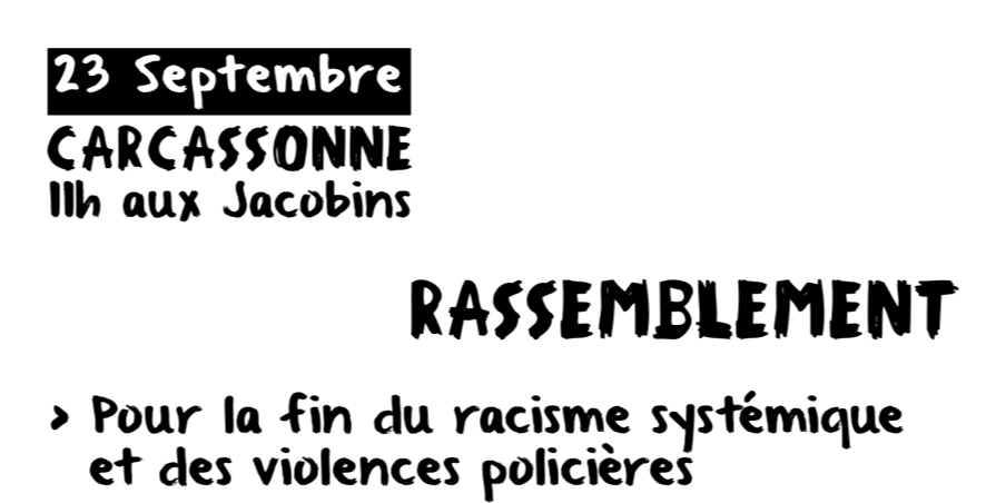 23 septembre à Carcassonne à 11 au portail des Jacobins : rassemblement pour la fin du racisme systémique et les violences policière et pour la justice sociale et les libertés publiques