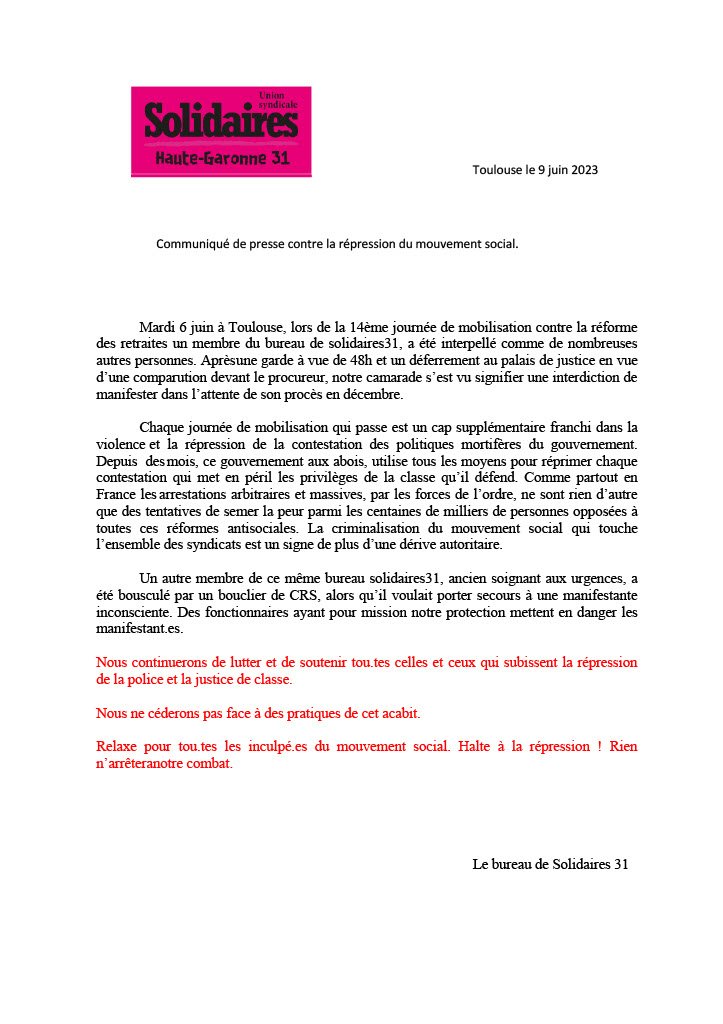 Mardi 6 juin à Toulouse, lors de la 14ème journée de mobilisation contre la réforme des retraites un membre du bureau de solidaires31, a été interpellé comme de nombreuses autres personnes. Après une garde à vue de 48h et un déferrement au palais de justice en vue d’une comparution devant le procureur, notre camarade s’est vu signifier une interdiction de manifester dans l’attente de son procès en décembre.