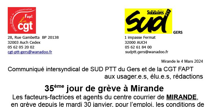 35ème jour de grève à Mirande Les facteurs-factrices et agents du centre courrier de MIRANDE, en grève depuis le mardi 30 janvier, pour l’emploi, les conditions de travail et un service public à visage humain POURSUIVENT LA GRÈVE.