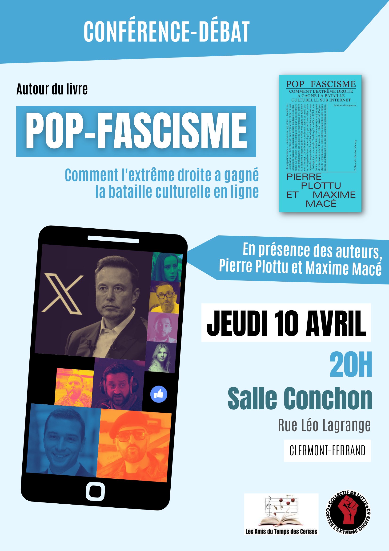 Le collectif 63 de lutte contre les extrêmes droites (dont fait partie Solidaires Auvergne) organise avec les amis du temps des Cerises une conférence débat autour du livre "Pop Fascisme. Comment l'etxrême droite a gagné la bataille culturelle en ligne", en présence des auteurs Pierre Plottu et Maxime Macé.