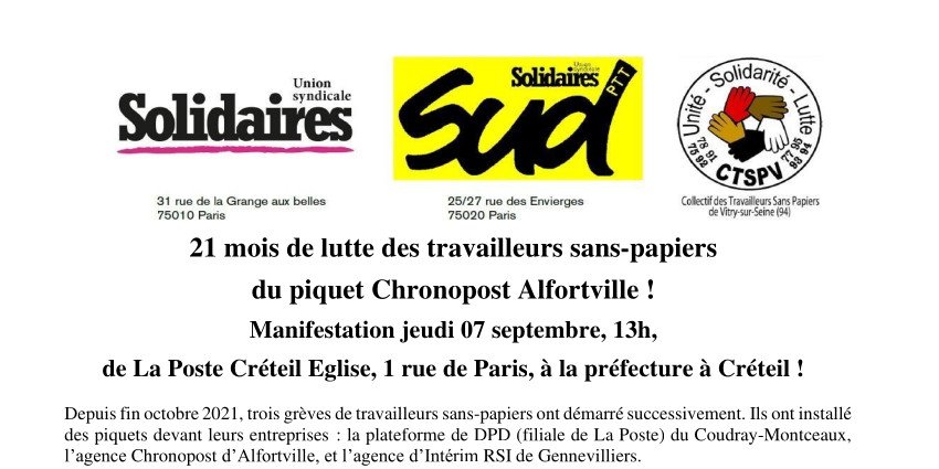 (Créteil) Manifestation le 7 septembre à 13h : 21 mois de lutte des travailleurs sans-papiers du piquet Chronopost Alfortville