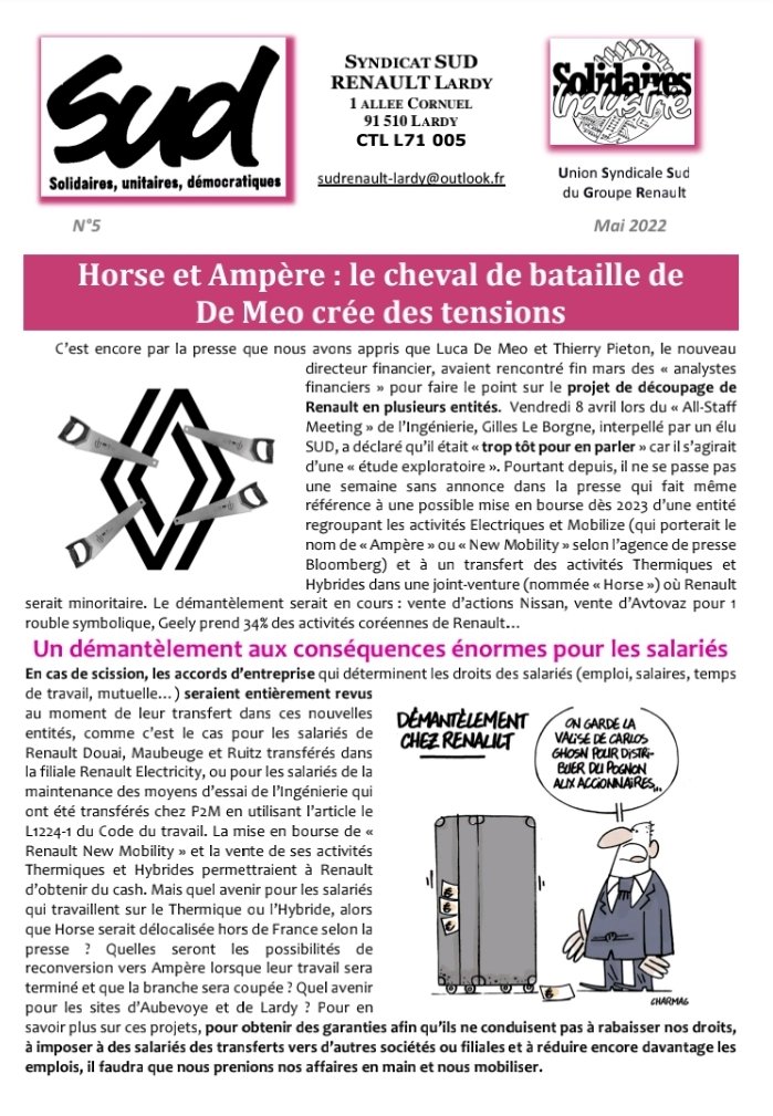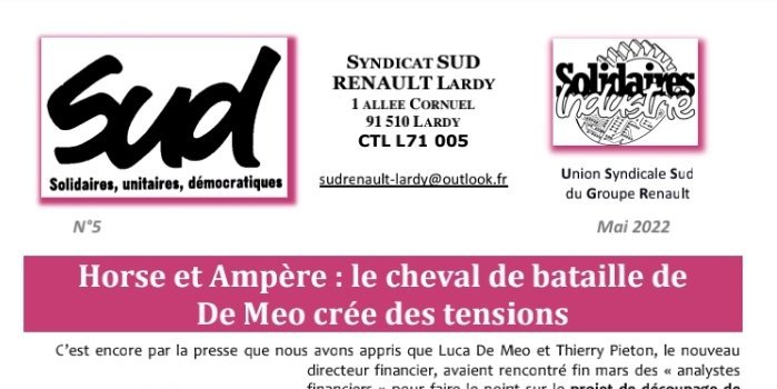 Contre le démantèlement du site, la CGT et SUD Renault Lardy appelle à faire grève et se rassembler mardi 18 mai de 10h à 11H devant le site.