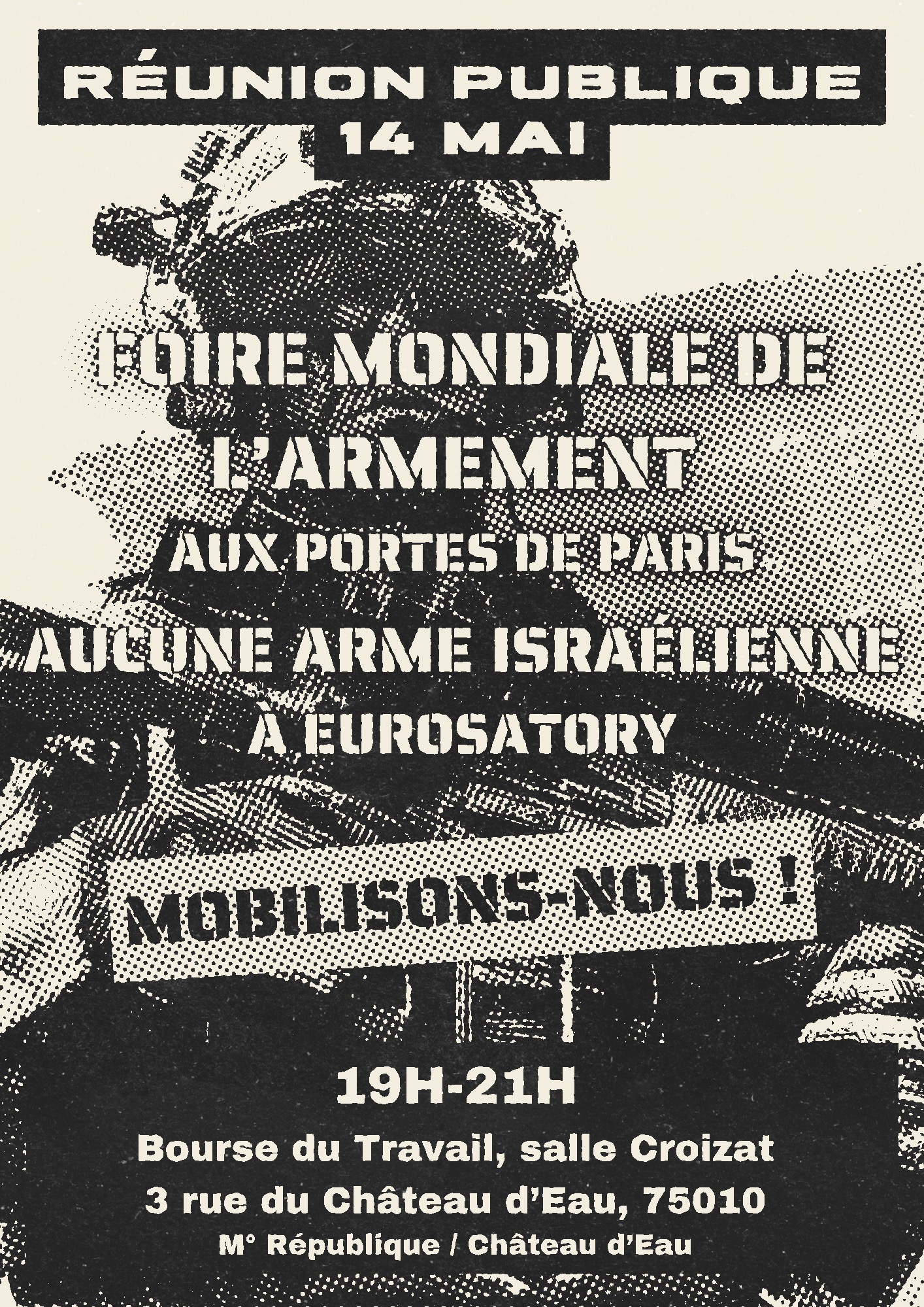 Foire mondiale de l'armement aux portes de Paris : Aucune arme israélienne à Eurosatory Mobilisons-nous ! Réunion publique à Paris - mardi 14 mai de 19h à 21h