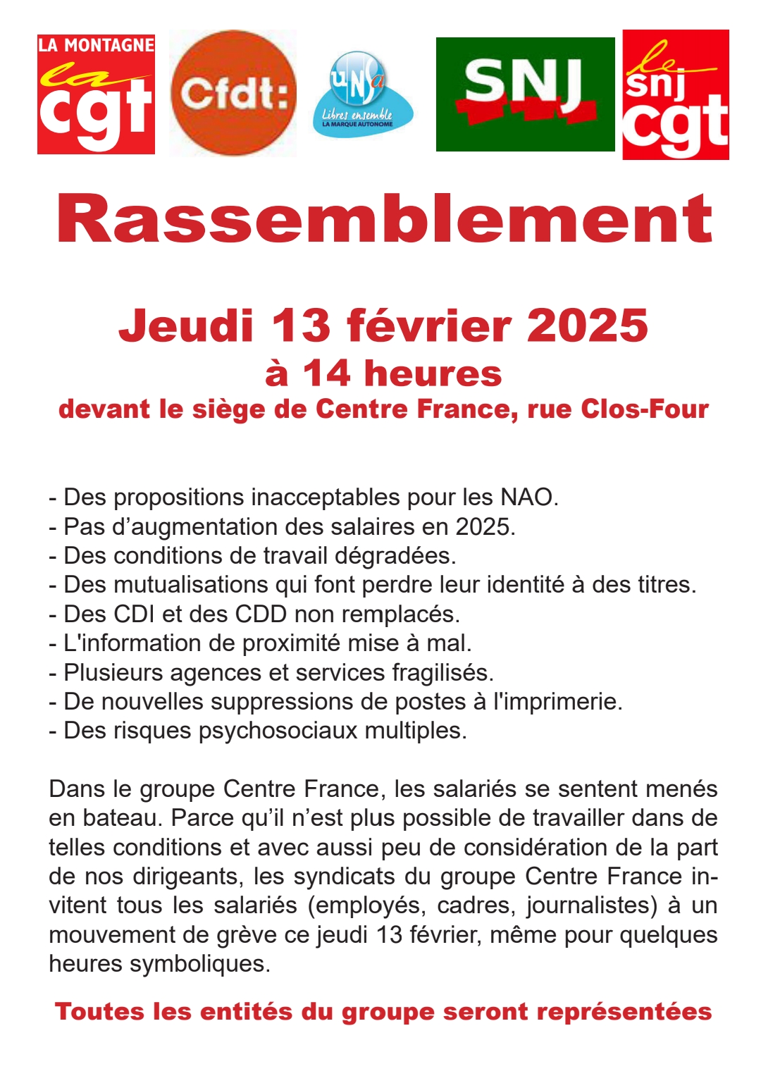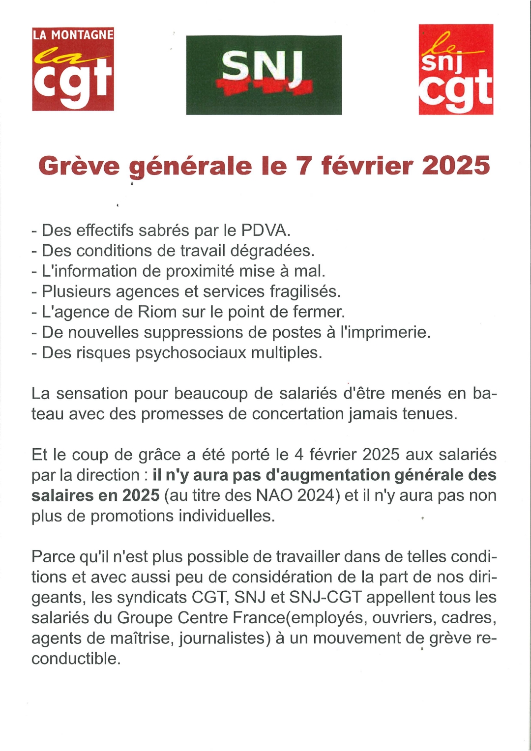 SNJ-CGT : Groupe Centre France: grève générale le 7 février 2025 | Syndicat National des Journalistes CGT