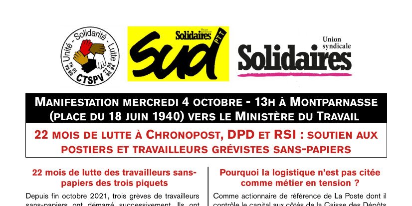 (Paris) Manifestation le 4 octobre : 22 mois de lutte à Chronopost, DPD et RSI : soutien aux postiers et travailleurs grévistes sans-papiers