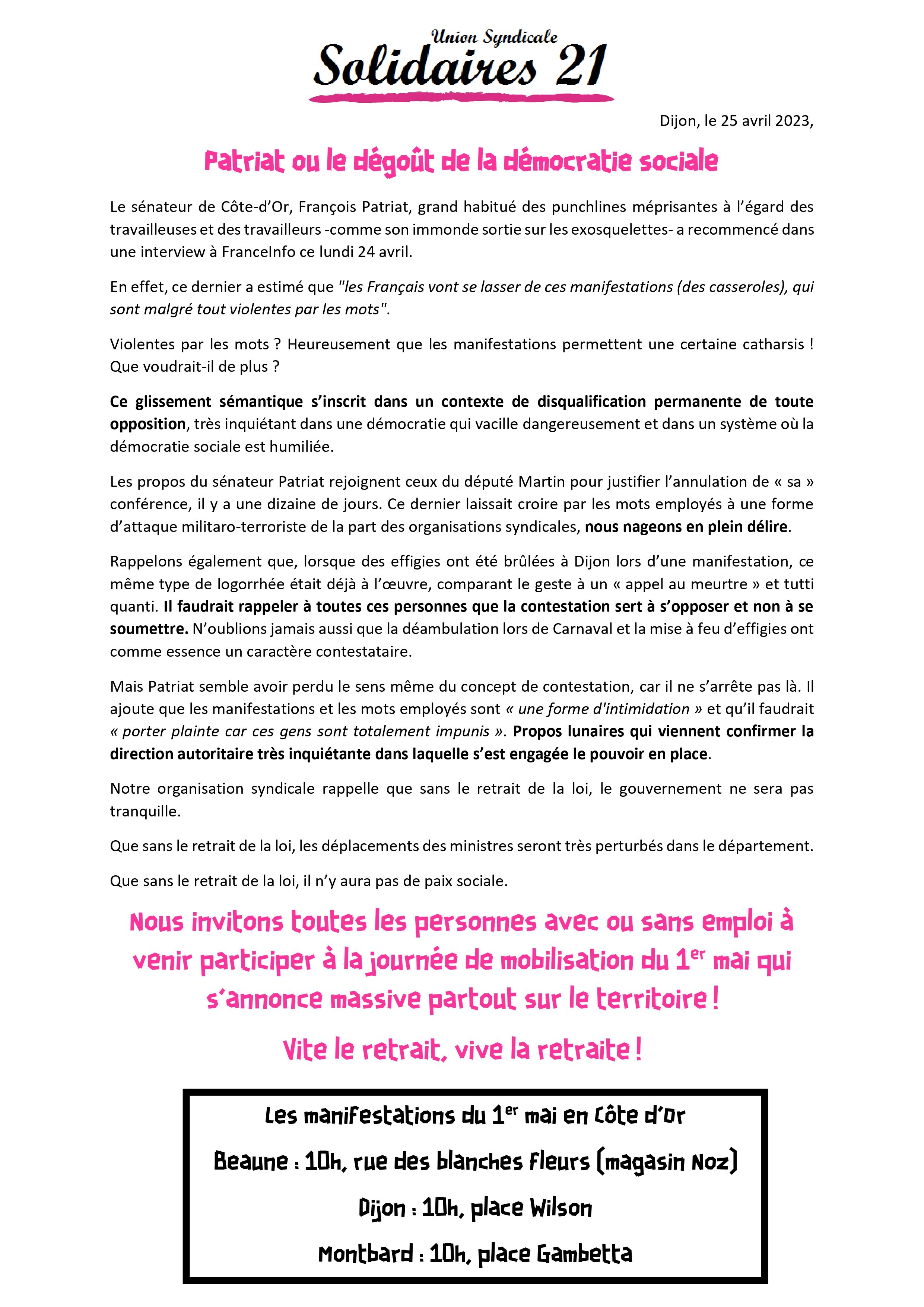 Les propos du sénateur Patriat rejoignent ceux du député Martin pour justifier l’annulation de « sa » conférence, il y a une dizaine de jours. Ce dernier laissait croire par les mots employés à une forme d’attaque militaro-terroriste de la part des organisations syndicales, nous nageons en plein délire.