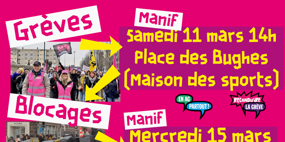 Retrouvons-nous nombreuses dans les AG sectorielles et les manifestations du 11 mars à 14h place des Bughes et 15 mars 10h place du 1er Mai pour décider ensemble des actions à déployer pour faire plier le gouvernement.