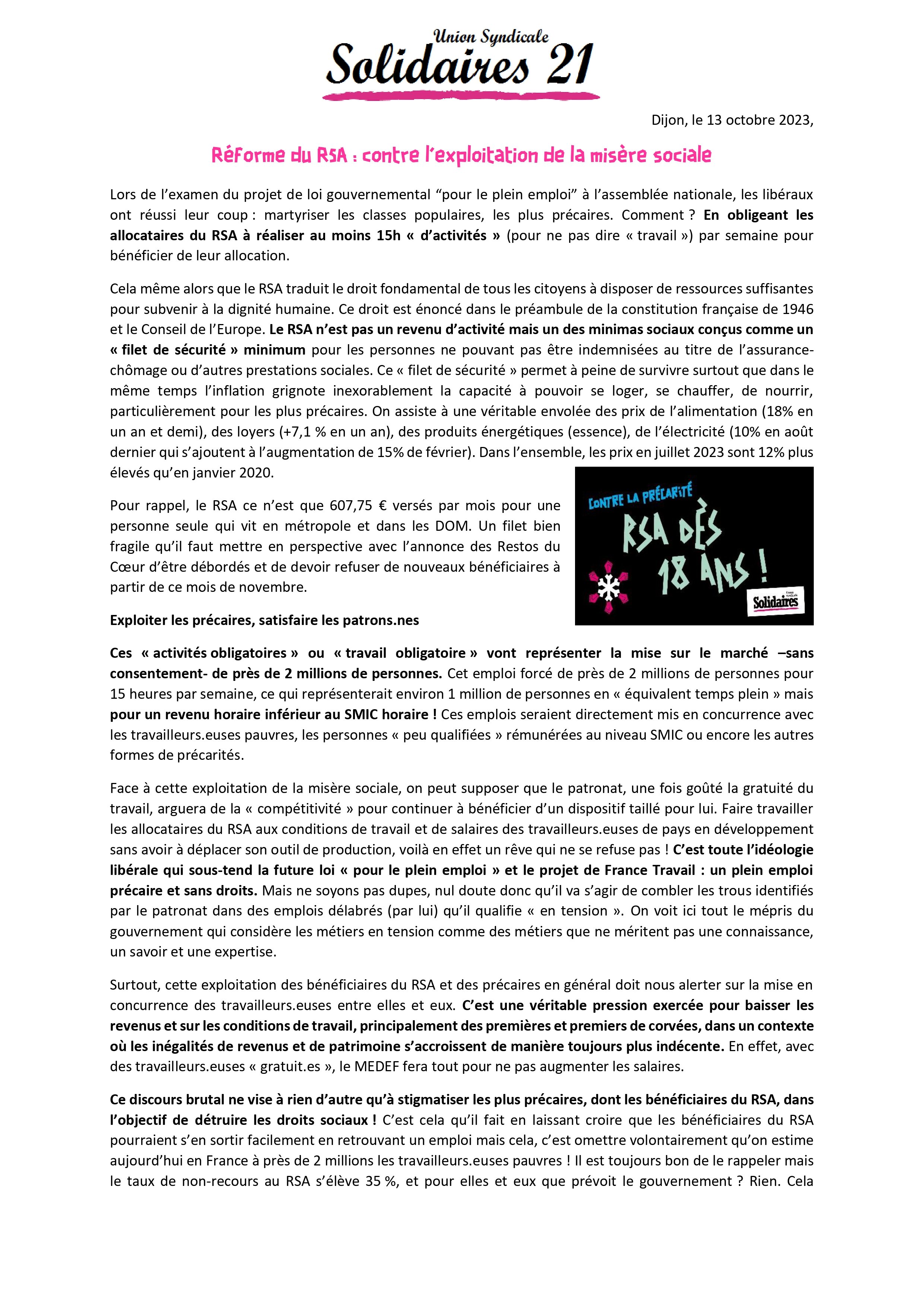 Dans les prochaines semaines, Solidaires 21 mènera des actions face au « RSA sous conditions » et défendra comme toujours les plus précaires !