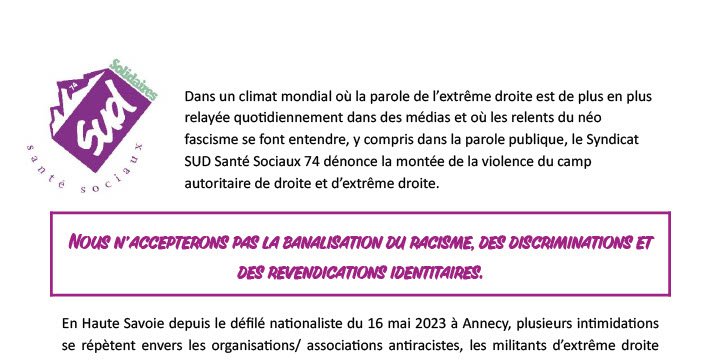 Solidaires 74 : Nous n’accepterons pas la banalisation du racisme, des discriminations et des revendications identitaires.