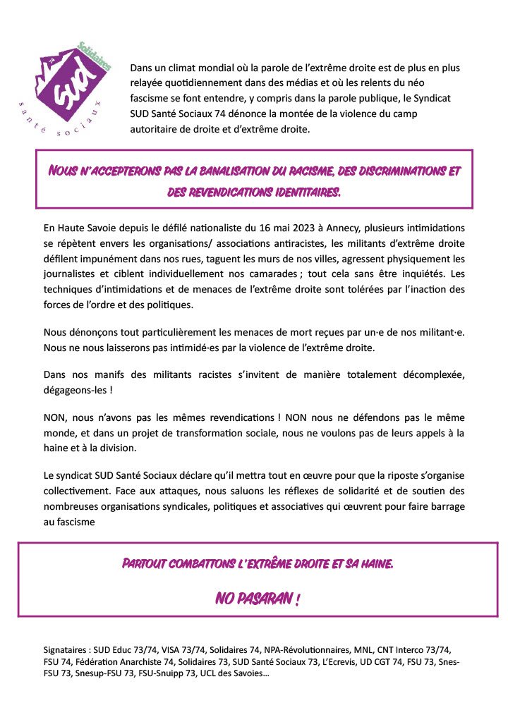 Signataires : SUD Educ 73/74, VISA 73/74, Solidaires 74, NPA-Révolutionnaires, MNL, CNT Interco 73/74, FSU 74, Fédération Anarchiste 74, Solidaires 73, SUD Santé Sociaux 73, L’Ecrevis, UD CGT 74, FSU 73, SnesFSU 73, Snesup-FSU 73, FSU-Snuipp 73, UCL des Savoies…
