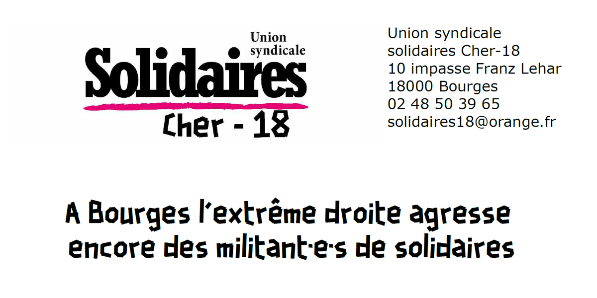 Solidaires Cher apporte son soutien aux camarades agressé·e·s car militant·e·s syndicalistes et antifascistes. Nous réaffirmons notre engagement plein et entier dans la lutte contre l’extrême droite et ses idées.