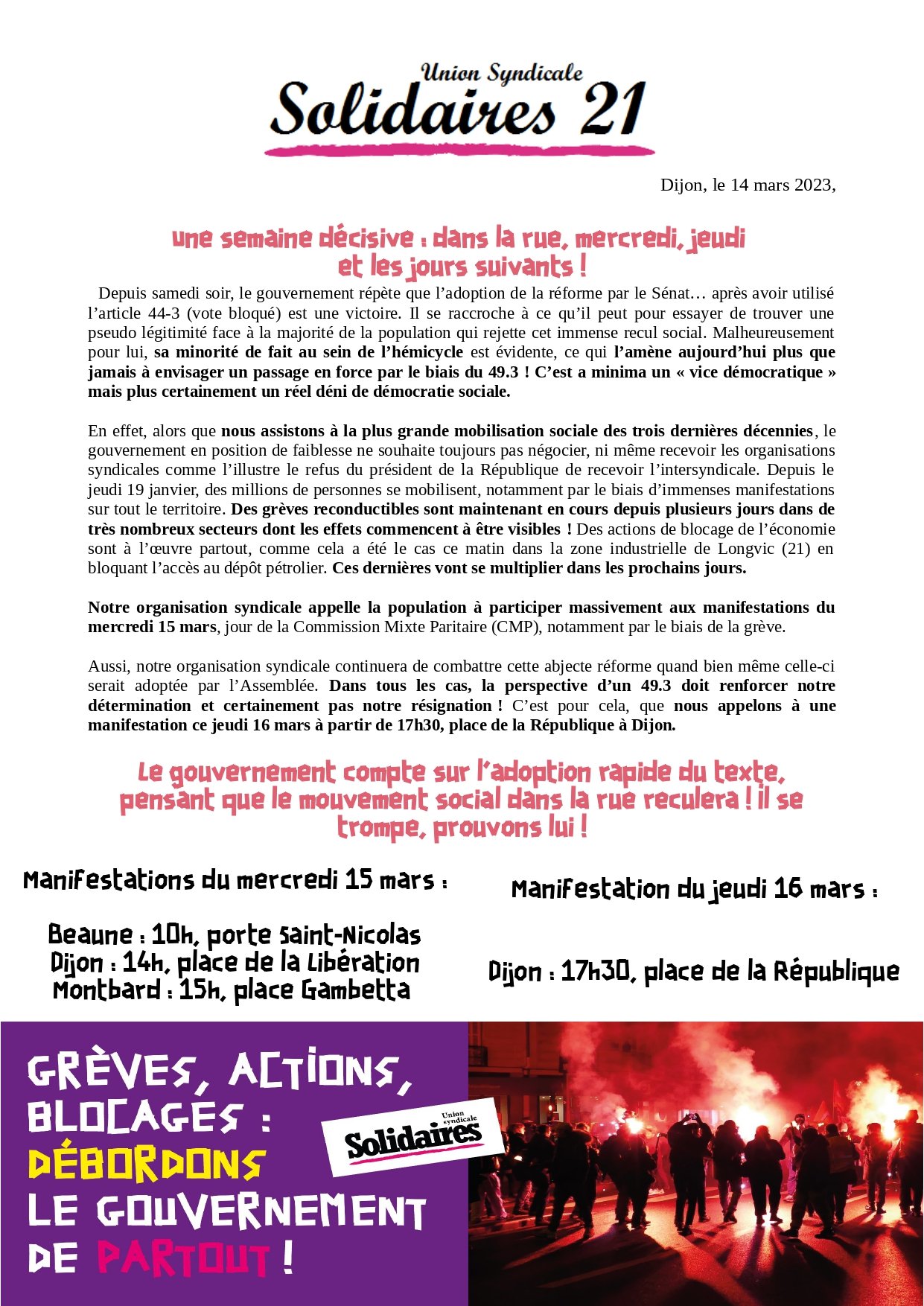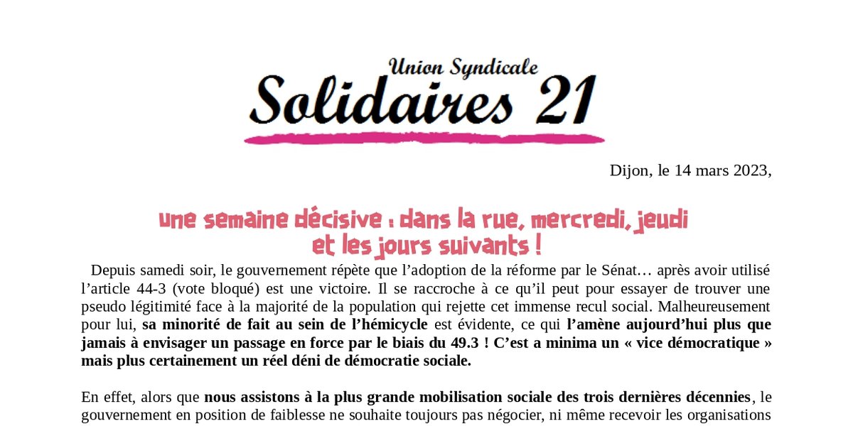 Aussi, notre organisation syndicale continuera de combattre cette abjecte réforme quand bien même celle-ci serait adoptée par l’Assemblée. Dans tous les cas, la perspective d’un 49.3 doit renforcer notre détermination et certainement pas notre résignation ! C’est pour cela, que nous appelons à une manifestation ce jeudi 16 mars à partir de 17h30, place de la République à Dijon.