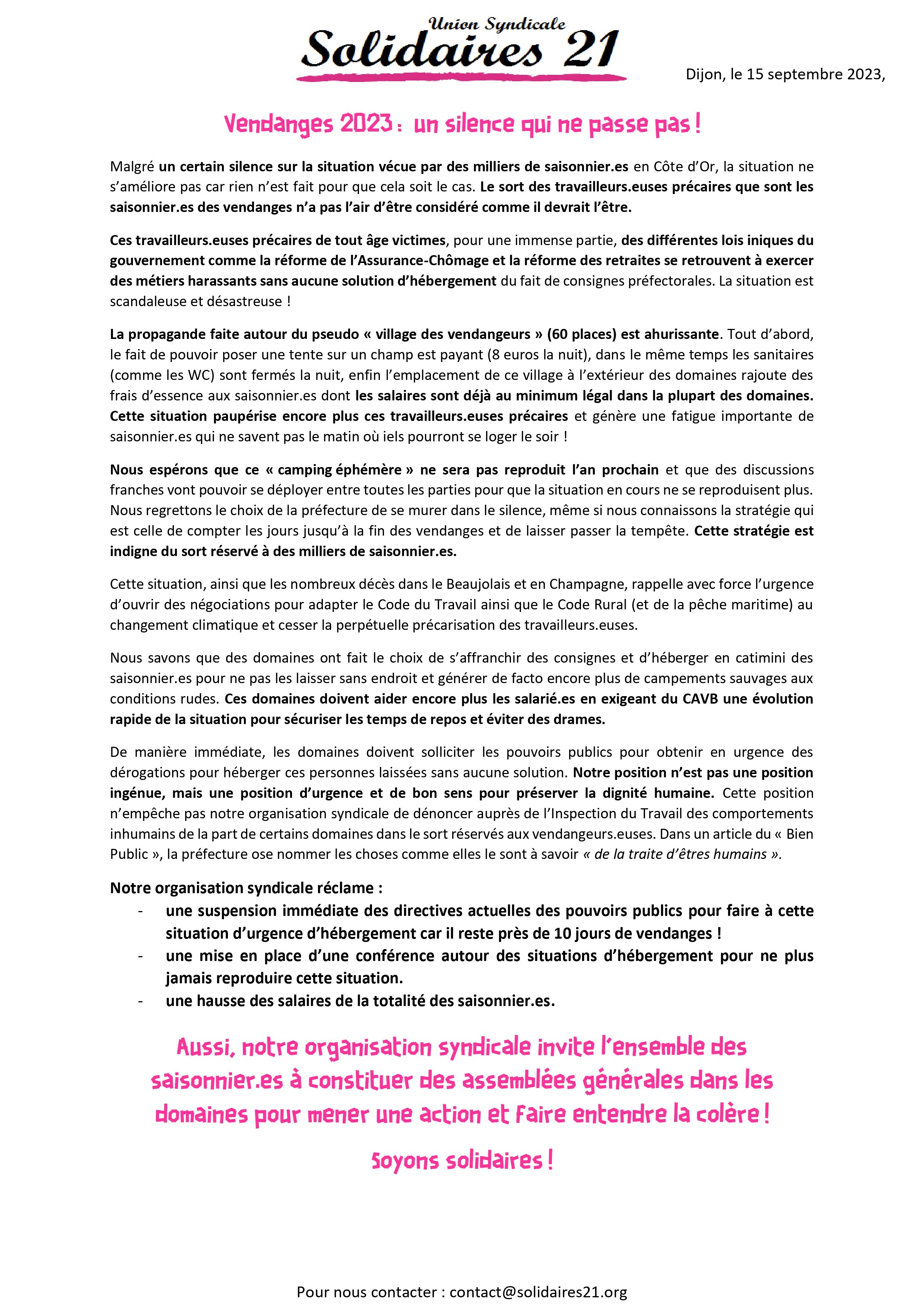 De manière immédiate, les domaines doivent solliciter les pouvoirs publics pour obtenir en urgence des dérogations pour héberger ces personnes laissées sans aucune solution. Notre position n’est pas une position ingénue, mais une position d’urgence et de bon sens pour préserver la dignité humaine. Cette position n’empêche pas notre organisation syndicale de dénoncer auprès de l’Inspection du Travail des comportements inhumains de la part de certains domaines dans le sort réservés aux vendangeurs.euses. Dans un article du « Bien Public », la préfecture ose nommer les choses comme elles le sont à savoir « de la traite d’êtres humains ».