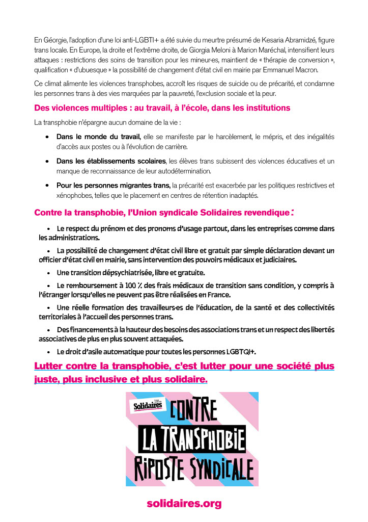 Contre la transphobie, l’Union syndicale Solidaires revendique :