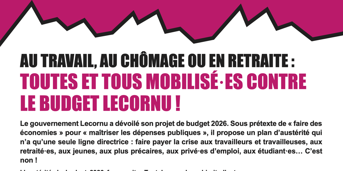 Le gouvernement Lecornu a dévoilé son projet de budget 2026. Sous prétexte de « faire des économies » pour « maîtriser les dépenses publiques », il propose un plan d’austérité qui n’a qu’une seule ligne directrice : faire payer la crise aux travailleurs et travailleuses, aux retraité·es, aux jeunes, aux plus précaires, aux privé·es d’emploi, aux étudiant·es… C’est non !