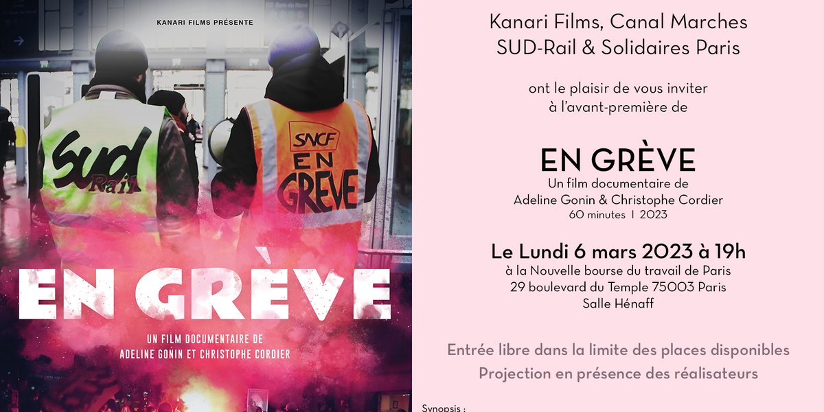 Dans le cadre de la mobilisation contre le projet de réforme des retraites la Fédération SUD Rail, Solidaires Paris, l'Union syndicale Solidaires, Kanari Film, et Canal Marche, ont le plaisir de de vous inviter à l'avant-première de En Grève, un film de Adeline Gonin et Christophe Cordier le 6 mars 2023 à 19h à Paris, Nouvelle Bourse du Travail, salle henaff, 29 boulevard du Temple .