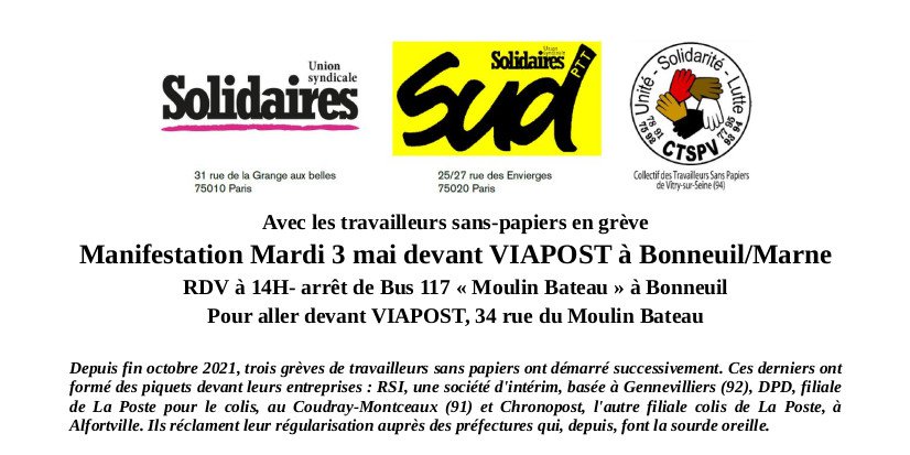Avec les travailleurs sans-papiers en grève, manifestation mardi 3 mai devant VIAPOST à Bonneuil/Marne à 14h